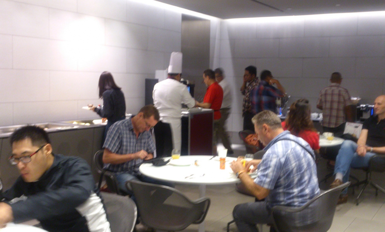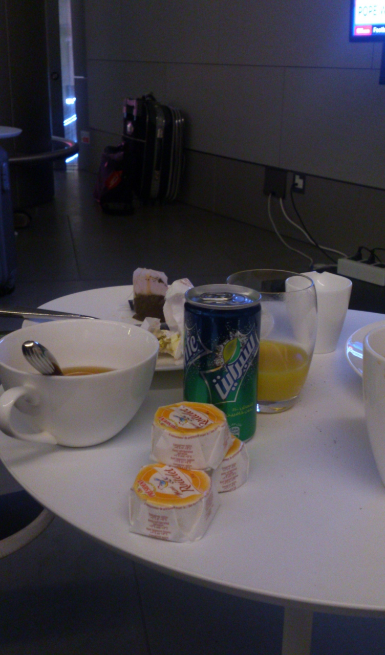 カタール航空の乗客以外のワンワールド会員を収容するラウンジ。広いスペースに簡易的なイスなどがあり清潔ですが完全に収容キャパオーバー。食べ物は粗末なうえにビスケット程度しか残って無い。トイレは大行列。完全な収容所状態。
