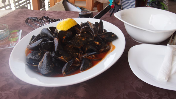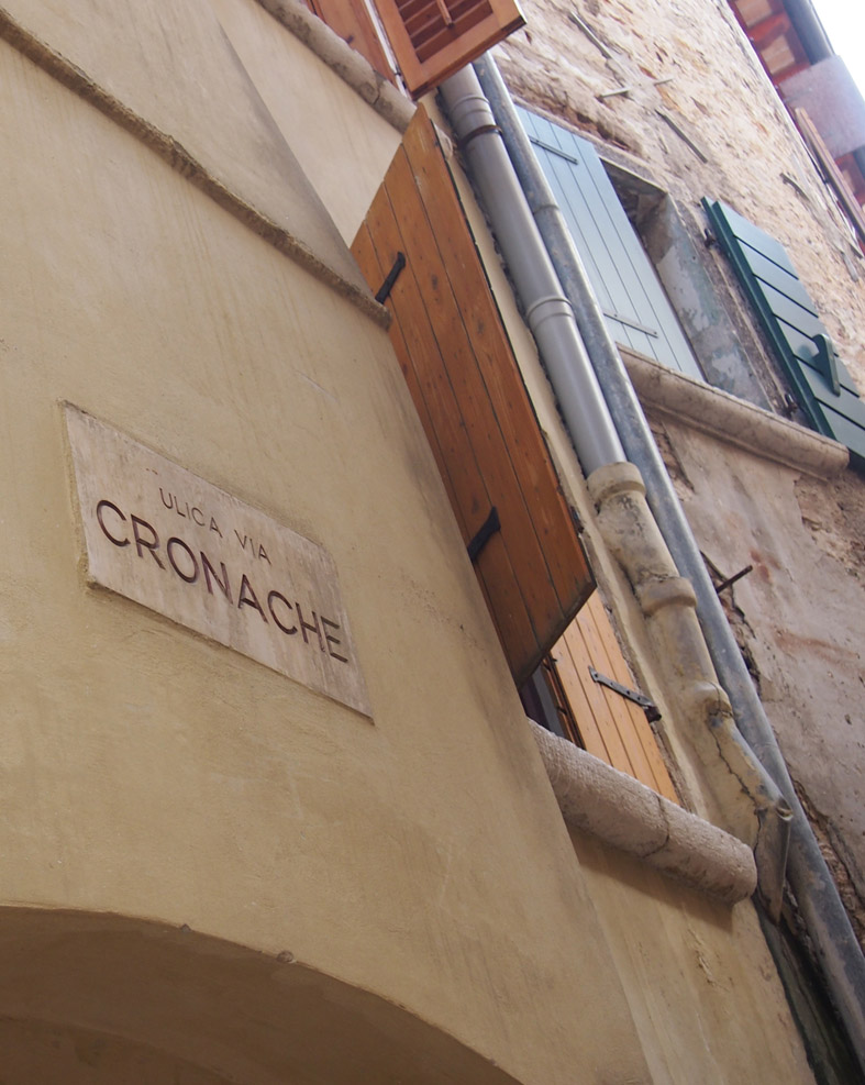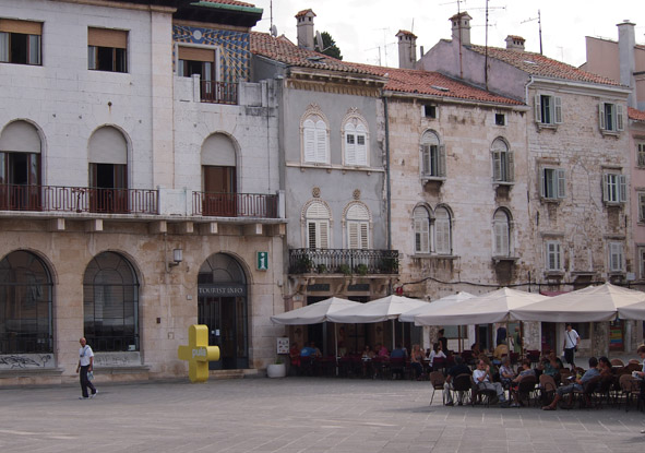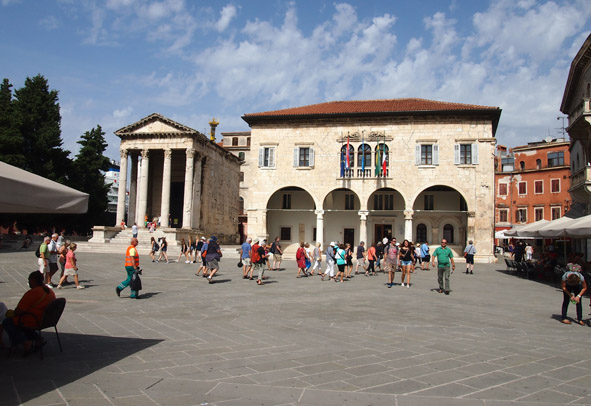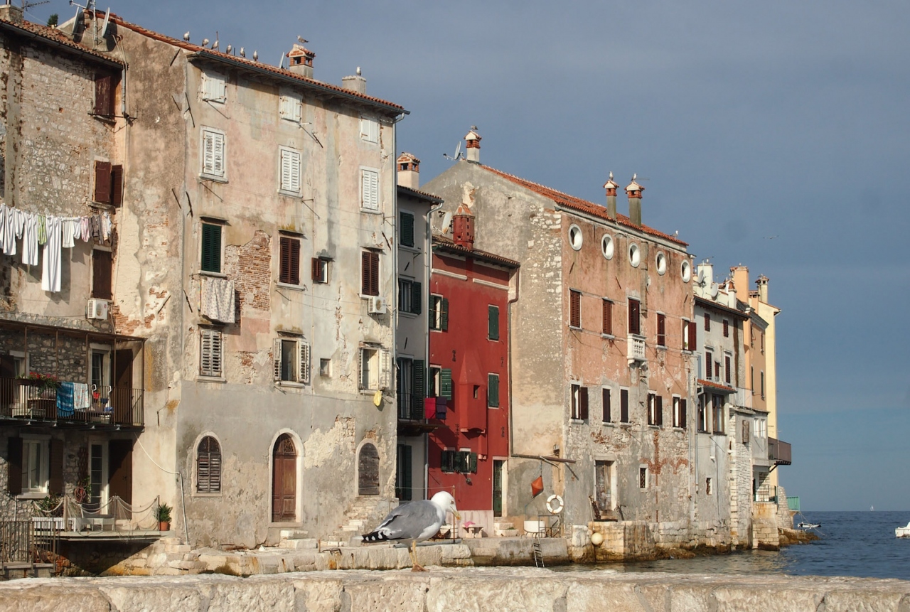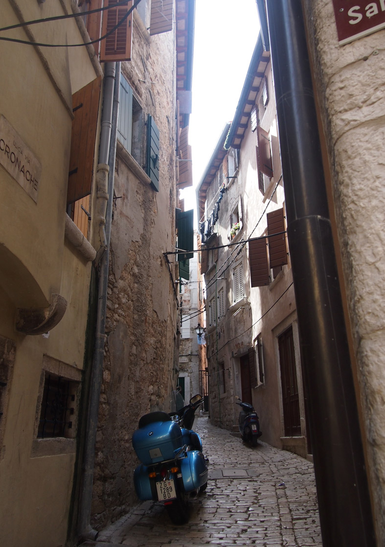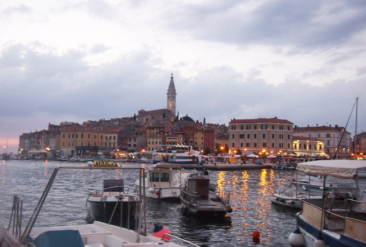ロヴィニ港を取り巻く海沿いのメインストリート。くの字に折れている為、聖エウフェミヤ聖堂を頂点とした旧市街が海に浮かぶように見えます。広い通りの陸側には海鮮を中心としたレストランがずらりと並んでいます。