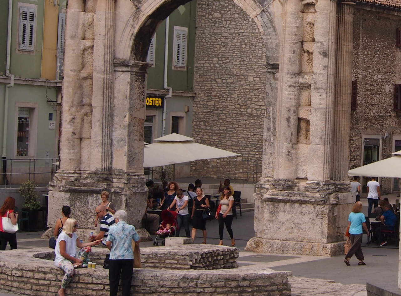 フォロ広場側からセルギイの凱旋門をくぐると少し開けた場所に出ます。サークルに敷かれた石が丁度良いベンチのようになっているあたりがTrg Portarataとなっているようです。ここはセルギ通りとGiardini通りが交差しています。
