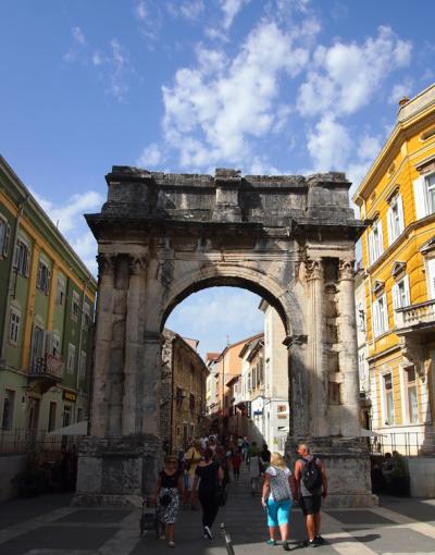 プーラ(PULA)港のフェリーふ頭に近い海辺の公園。幾つかの遊歩道は散策に丁度良い距離です。奥にはテラス席のあるカフェもありました。公園のうらには荘厳なプーラの老舗ホテルであるホテルリヴィエラがあります。