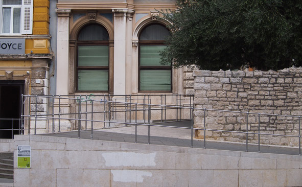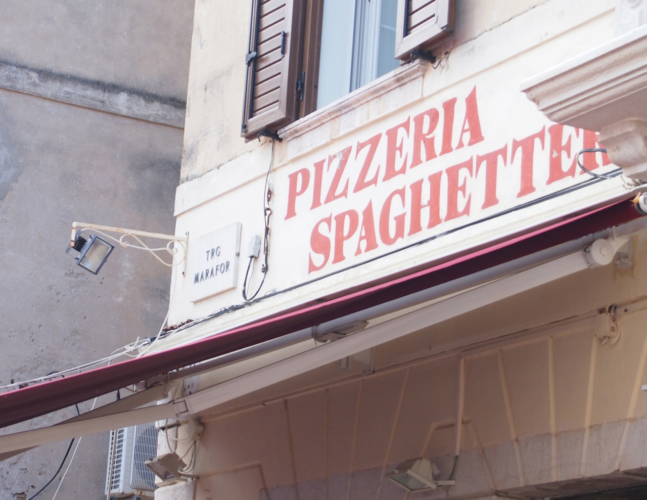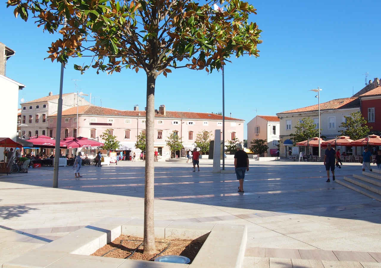宿泊したホテルの敷地を通る人がやっとすれ違うほどの幅の道路。海辺から登って行くとそのままエウフラシウス聖堂の入口に続いています。路地には街で早起きのパン屋さんが店を開けると待ちわびたように地元の人が買い求めて行きます。