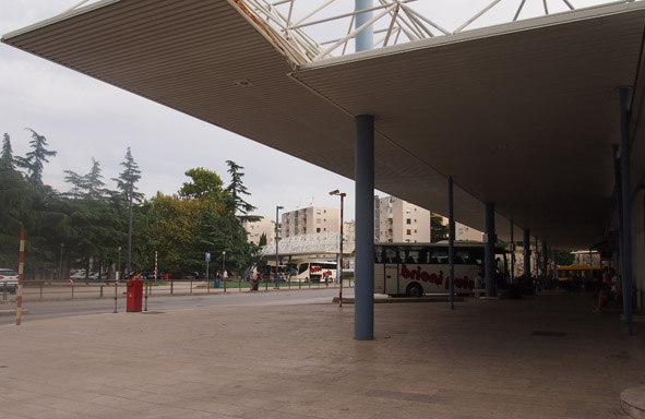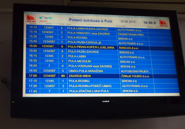 ザグレブの長距離バスで約5時間位(途中でリエカなどで休憩あり)でしょうか?プーラのバスターミナルは平屋建ての広いですが簡素なバスターミナルです。旧市街から徒歩で15分位ですが石畳の起伏のある道なのでスーツケースでは徒歩はキツイかもしれません。大抵は2~3台のタクシーも停車しているのでホテルまでの行き方に不安のある方はタクシーをお薦めします。