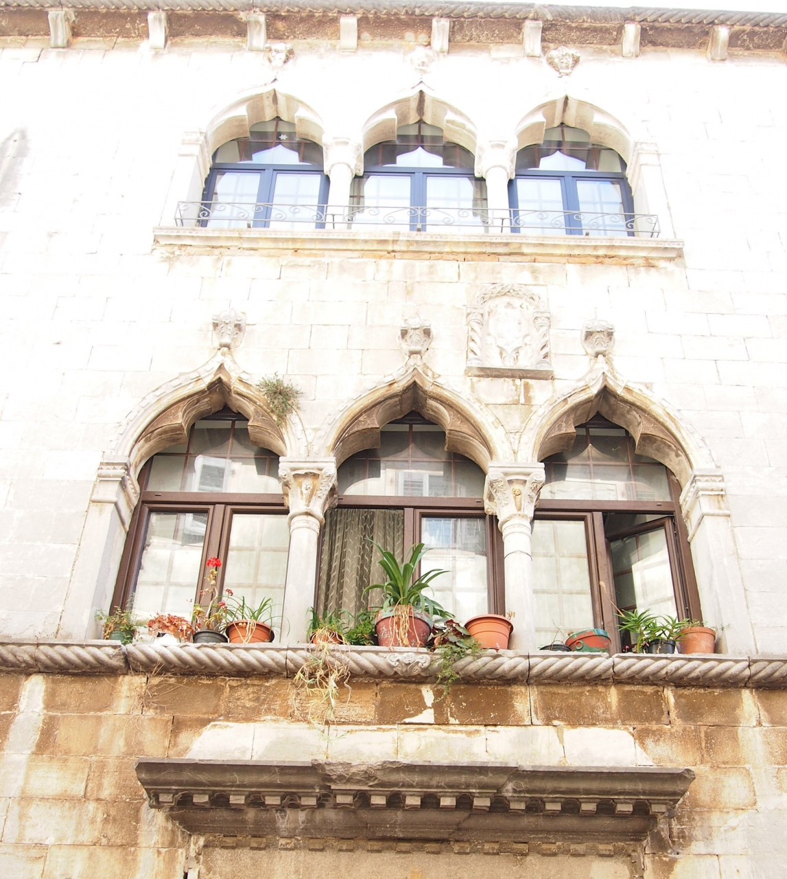 旧市街のマウロ通り(St. Mauro )にある古い建物。15~16世紀に建てられたそうです。二階の窓を挟むように配置された聖人像はその色で分かるように更に時代が古く13世紀頃に作られたようです。やさしく見守る聖者の像が印象的な建物です。