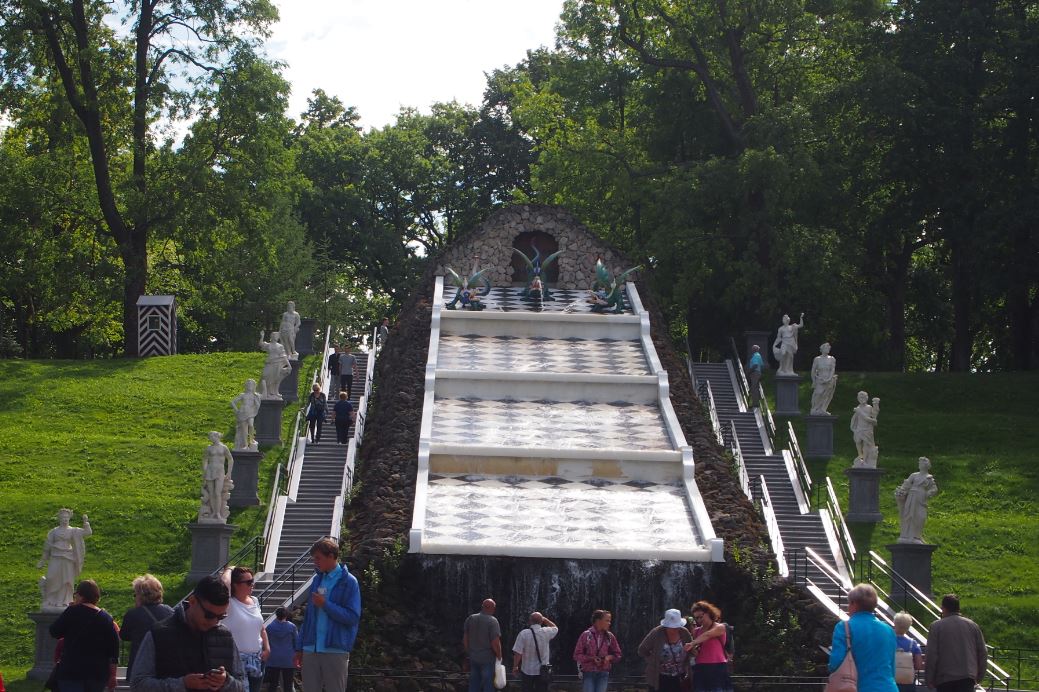 Chessboard Cascadeはぺテルコフの丘の勾配を利用した珍しい噴水施設です。最近補修をされたようでまだ真新しい感じがしました。チェスボードの上部に配置されたドラゴンから放たれた水がチェス盤の上を流れてゆきます。記念撮影の列ができていました。