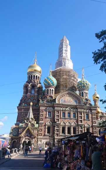 血の上の救世主教会 (Church of the Savior on Spilled Blood)はGriboyedova運河のほとりに立つ鮮やかな教会です。サンクトペテルブルグ市内には荘厳な教会はいくつかありますが規模大きくありませんがドームを中心に特徴的な玉ねぎの屋根が数多くちりばめられています。内部はモザイク画が圧巻です。