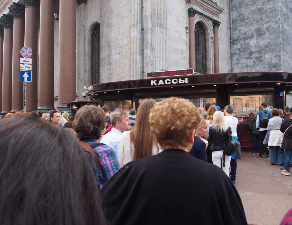 サンクトペテルブルグの市内の至る所から見る聖イサアク大聖堂 (Saint Isaac's Cathedral)の大きな玉ねぎ型の屋根は近くで見るとまた違った偉容を感じます。建物の広場側にチケット売り場がありますが相当な行列ができているのに昼休みはクローズ。おまけに団体用のチケット窓口も一緒みたいでいっこうに進む気配なし。ドームの中は圧巻の装飾だけにオペレーションが残念です。