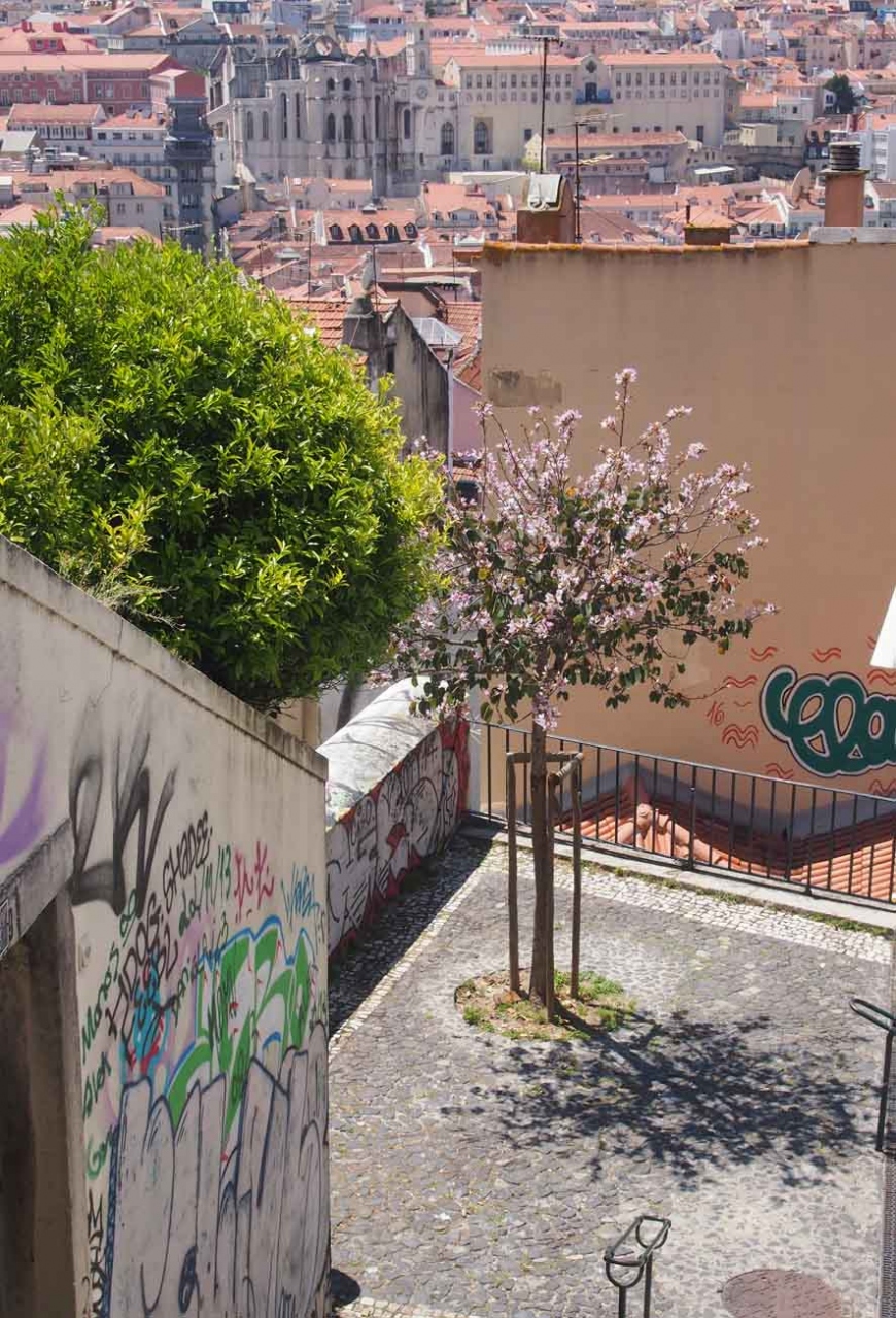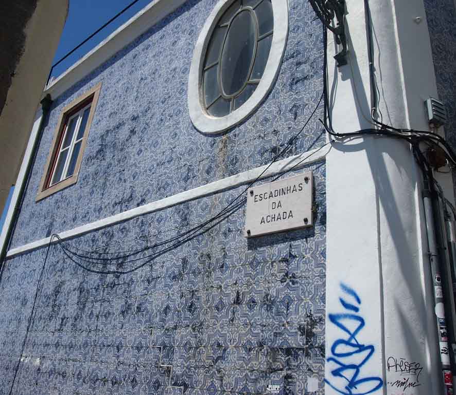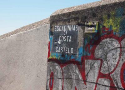 グラサ地区からサン・ジョルジェ城経由でアルファマ地区まで半日かけて散策した際に見つけました。ラルゴ・ダ・ローザ通り(Largo da Rosa )から下の通りに繫がる階段がコスタ ド カストロの階段 (Escadinhas da Costa do Castelo)です。階段の終わり位からサン・ジョルジェ城が見えて来ます。