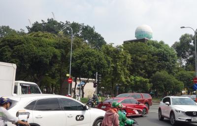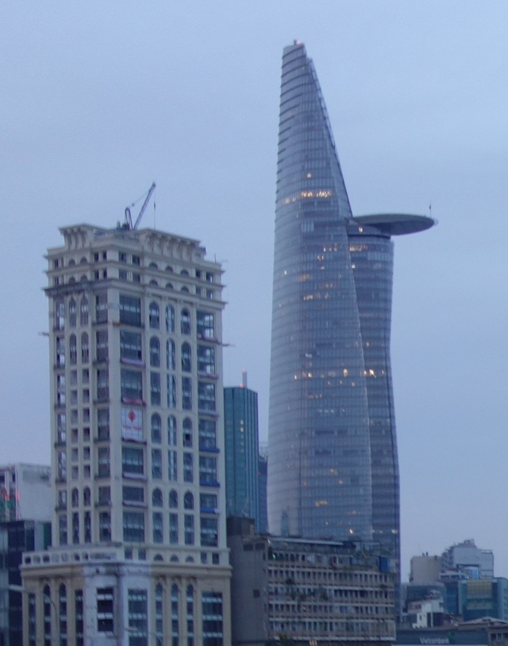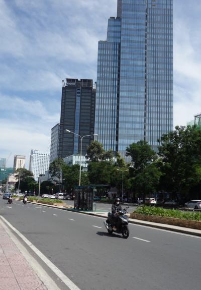 フエ通りだけではなくホーチミン市のランドマークとなっているビテクスコ フィナンシャルタワー (The Bitexco Financial Tower )。サイゴン川とタオディエン方面に舌の様なスカイデッキが張り出しています。かなり遠くからでないと全景を収める事ができません。サイゴン川から見るとほかのビルを従えているようで高さが際立ちます。