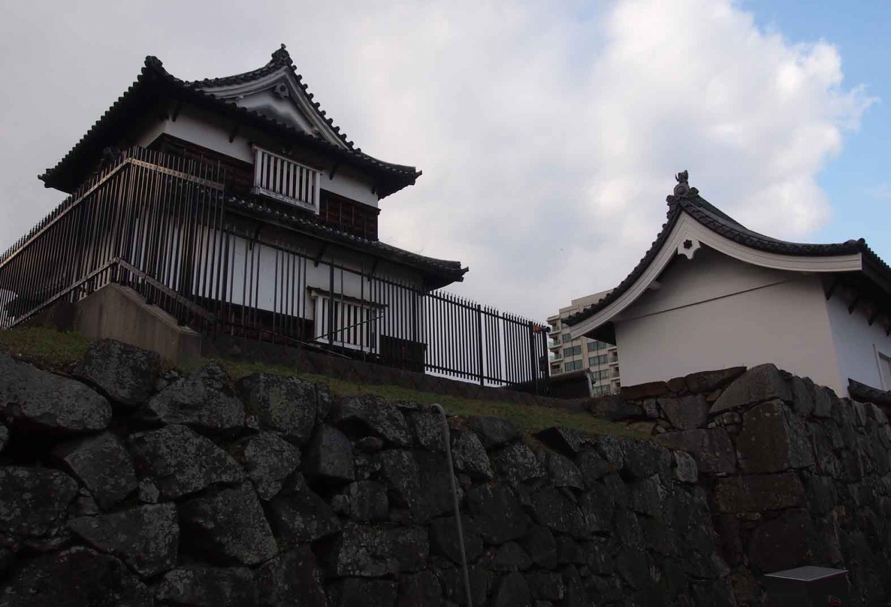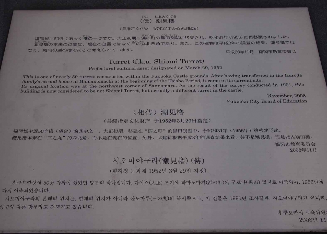元々福岡城の三の丸に建てられ博多の海を見張る事から潮見櫓と呼ばれ現在の位置に移設されたと伝えられていたそうです。その後調査によって潮見櫓とは別の建物である事が判明したそうです。と言う事で現在この建物は(伝)潮見櫓と表記されています。