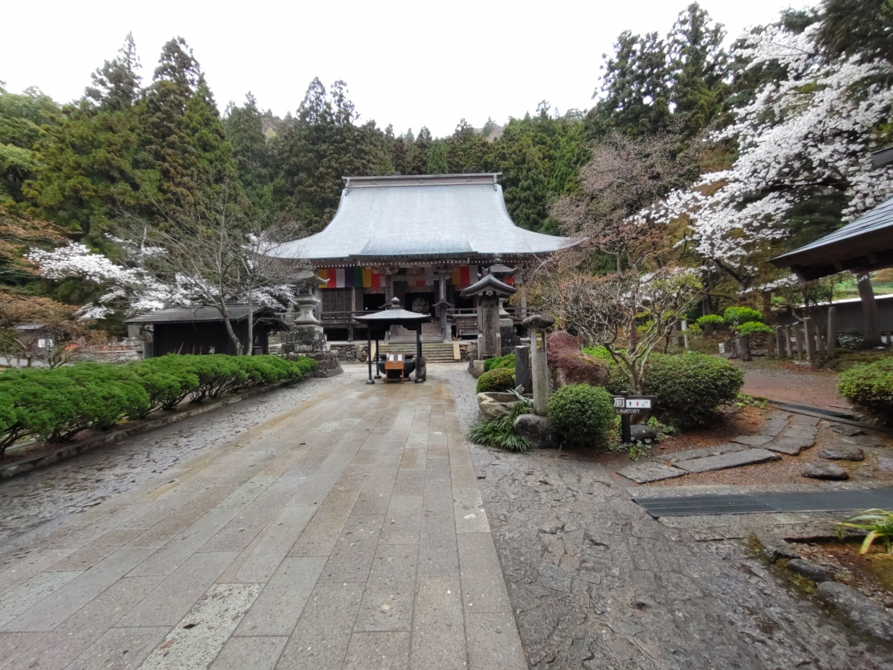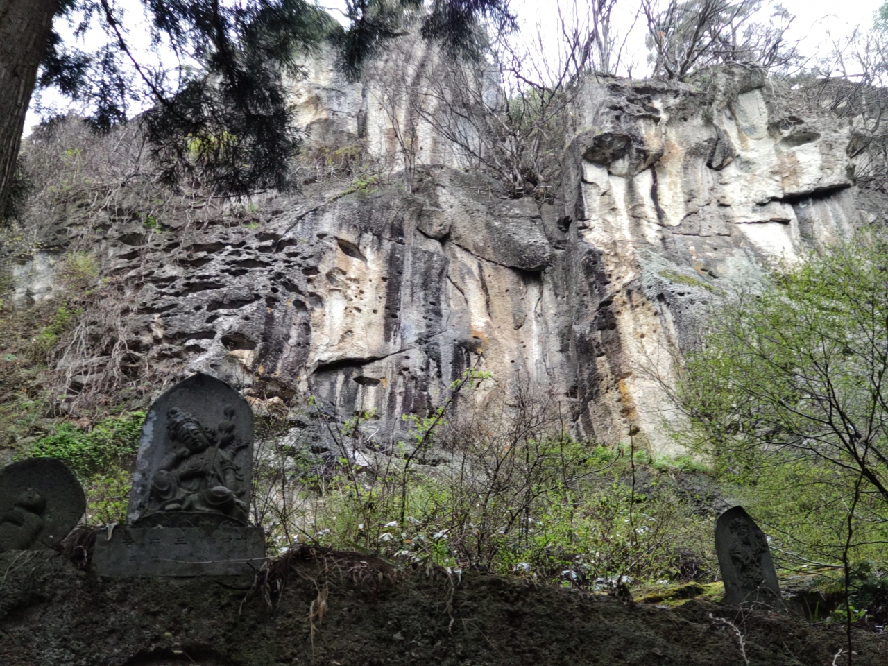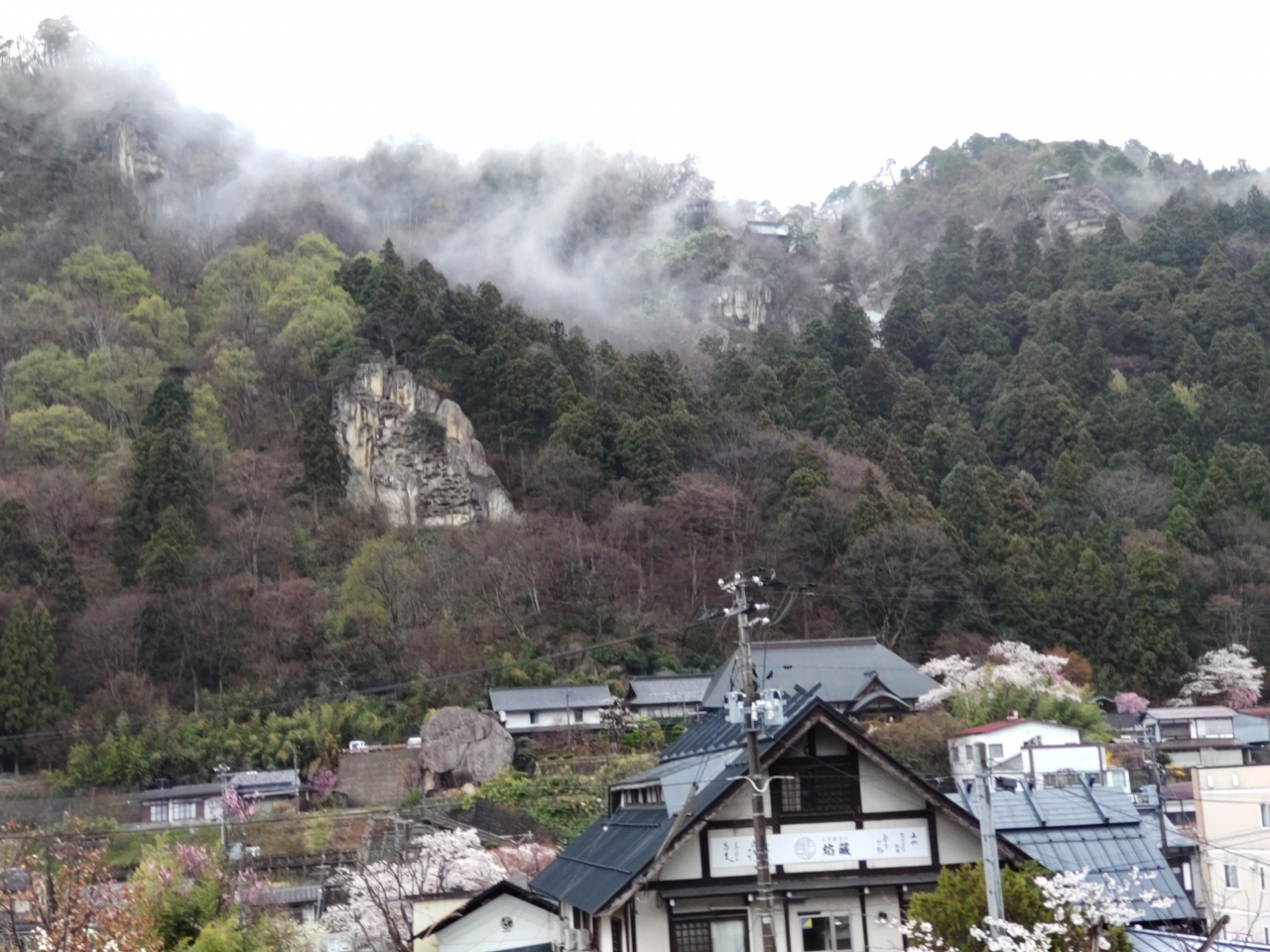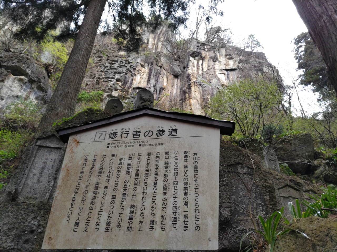 宝珠山立石寺は、860年に慈覚大師が開いた天台宗の寺院であり、東北地方を代表する霊場として信仰を集めている。根本中堂、常行念仏堂、本坊、五大堂、奥の院など多くの伽藍が岩山の斜面に立っている。山門から奥の院までは800余段の石段が続いている。JR山寺駅から根本中堂を経て、五大堂、奥の院までを参拝して往復するには、最低2時間は必要、歩きやすい靴を履いた方が良い。入山料は山門で支払う。4月中旬に訪れたとき、約半数は外国人だった。