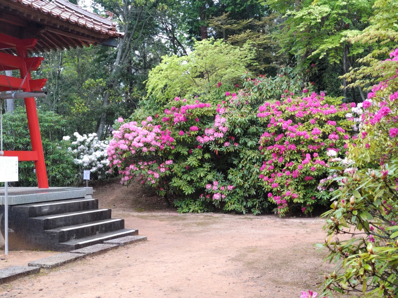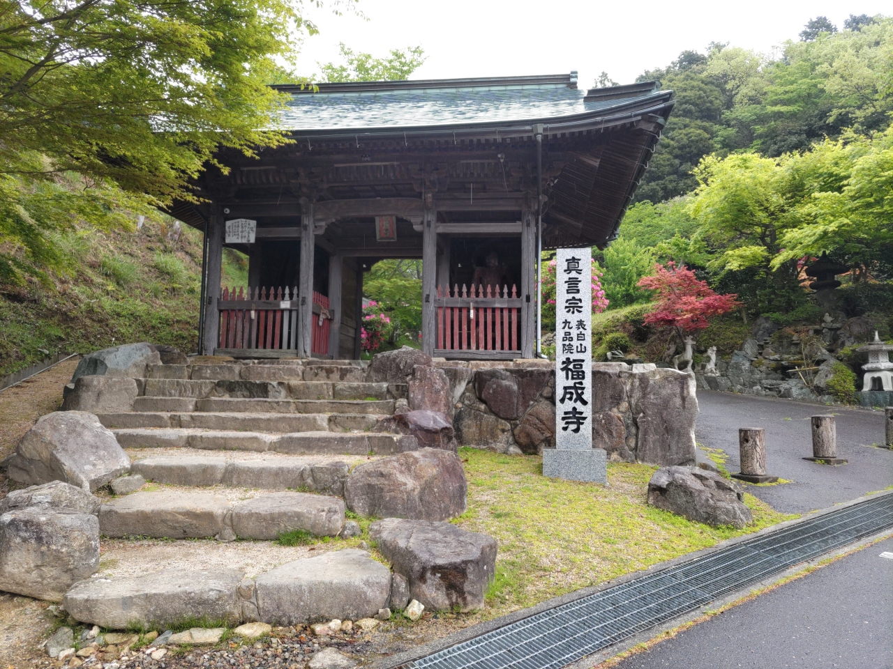 福成寺は、東広島市の西条盆地を眼下にのぞむ山頂近くにある真言宗御室派の寺院である。奈良時代に開基、平安時代には源氏と平氏との戦いの舞台にもなったとされ、戦国時代には毛利氏と伊予の河野氏が会談した寺院でもある。本堂内の厨子と須弥壇は、山口の大内氏がの寄進によるもので、国の重要文化財に指定されている。毎年4月のニュースで満開のシャクナゲの花の映像が流れるので訪れてみたが、境内全体に色とりどりのシャクナゲが咲き誇り、見事だった。
