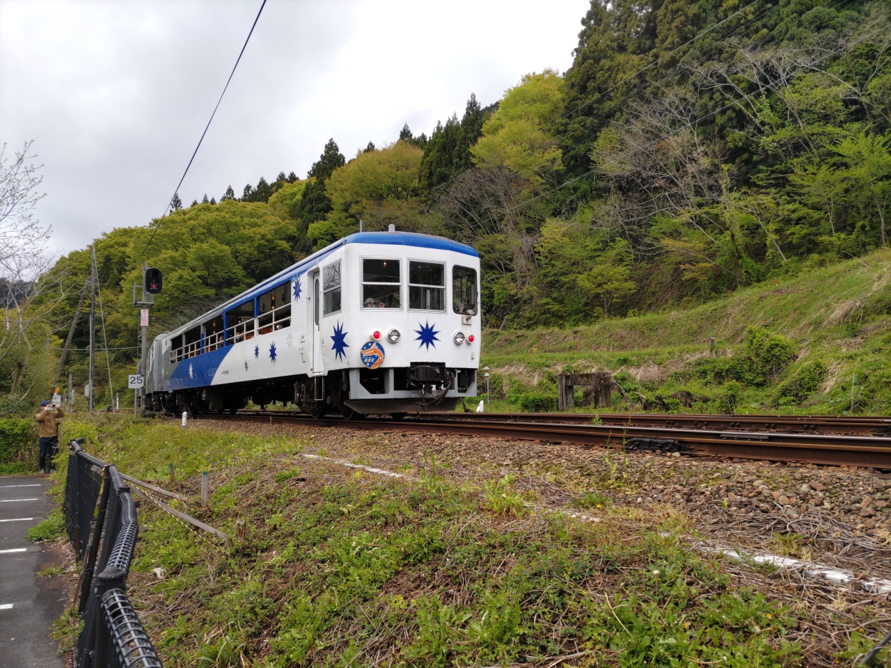 奥出雲おろち号は、JR木次線の木次駅・備後落合間を走るトロッコ列車である。窓ガラスのない車両から、ヤマタノオロチの伝説や、数々の神話の舞台となった奥出雲をゆっくり走り、四季折々の自然を満喫することができる。社内はウッッデイでレトロな雰囲気になっている。今年度は4月1日からの運行だが、11月中旬で最後の運行となり、貴重な姿を見られるのは今年までである。4月下旬の平日、出雲坂根駅で偶然にもおろち号に遭遇することができた。