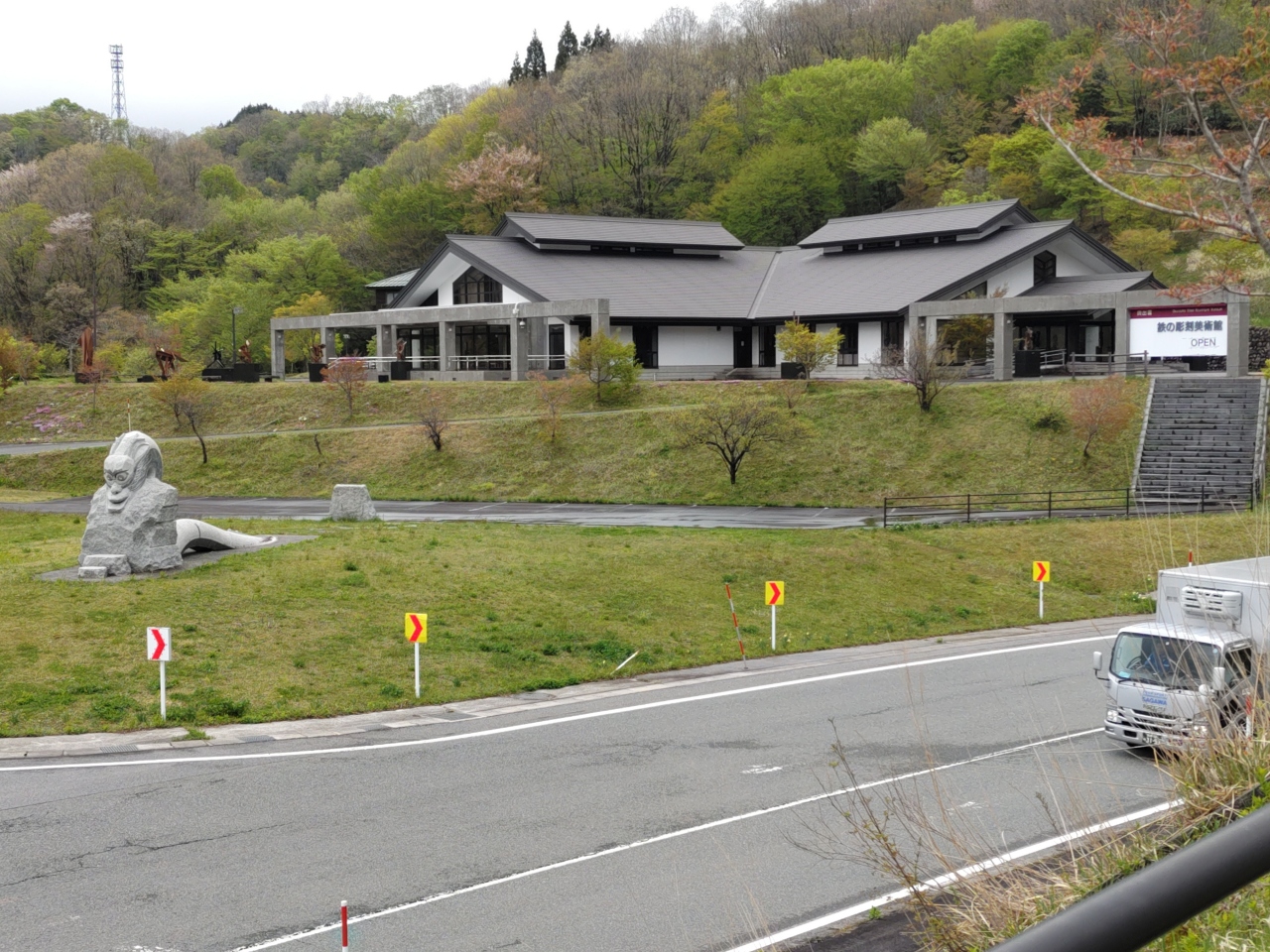 島根県雲南市から国道314号を南下すると、広島県境近くに道の駅「奥出雲おろちループ」があり、国道を挟んで反対側(北側)に鉄の彫刻美術館がある。道の駅からも国道を超えて陸橋を歩いて直ぐである。この美術館は、「神話の町」、「鉄の町」の奥出雲のシンボルとして設立されたもので、剛鉄による彫刻作家の故下田治氏が制作した作品が展示されている。館内には、展示室のほか研修室なども併設されており、館外にもいくつかの彫刻が置かれている。静かな雰囲気で独特の鉄の芸術をゆっくり鑑賞するのもなかなか良い。入館無料である。
