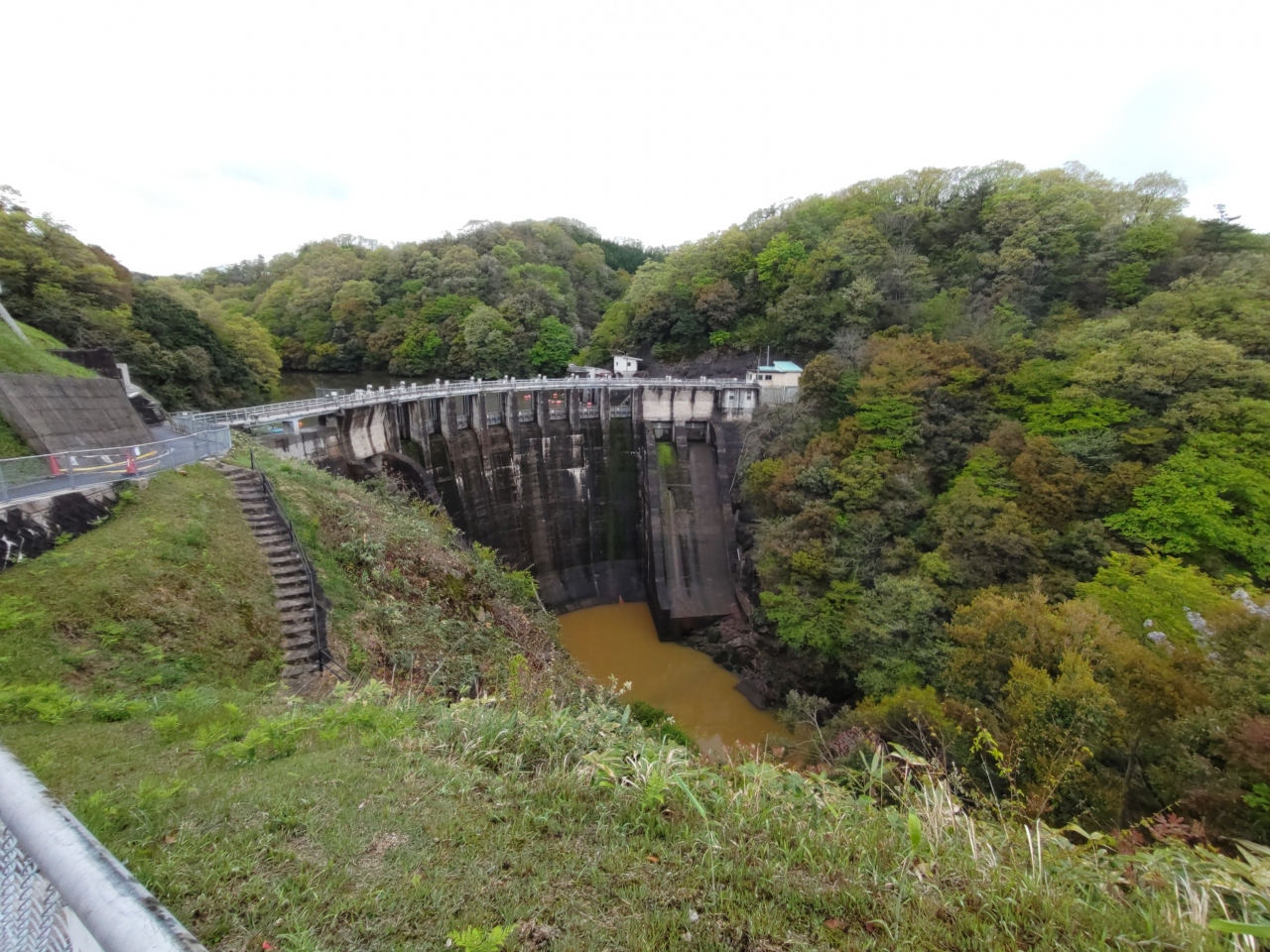 島根県奥出雲町の船通山から中海まで、長さ153㎞の斐伊川が流れている。奥出雲町三成に日本で最初の本格的アーチダム、砂防と発電を目的とする三成ダムが昭和29年に完成した。斐伊川の上流では昔から「かんな流し」で砂鉄が採取され「たたら製鉄」が行われてきた。また、たびたび起こる斐伊川の氾濫が出雲神話「八岐大蛇」のもとになったともいわれている。国道314号から100mあまり南に登ったところに駐車場があり、ここからダムを眼下に見ることができるが、堰堤までは進入禁止になっていた。堰堤の下に貯まった水は赤茶色だったが、おそらくこれは鉄分の影響と思われる。