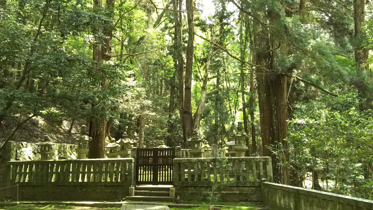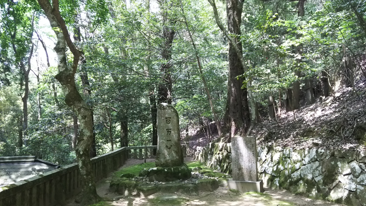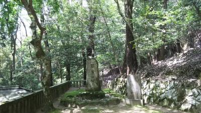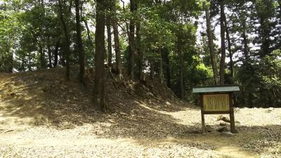 広島から国道54号線を北上し、安芸高田市消防署の前を左折して県道6号線に入り、400mほど走って右折すると安芸高田市歴史民俗博物館があります。その横から少し登っていくと大通院谷遺跡があり、その北東にある小さな駐車場に車を停めて、右回りに郡山城跡の山道を歩きました。駐車場から20分ほど歩くと、百万一心碑と毛利元就墓所があり、その裏の山道を30分あまり登っていくと、本丸及び櫓台があります。郭など建物はまったく残っていませんが、林の中に石垣の石などが点在し、昔をしのばせます。