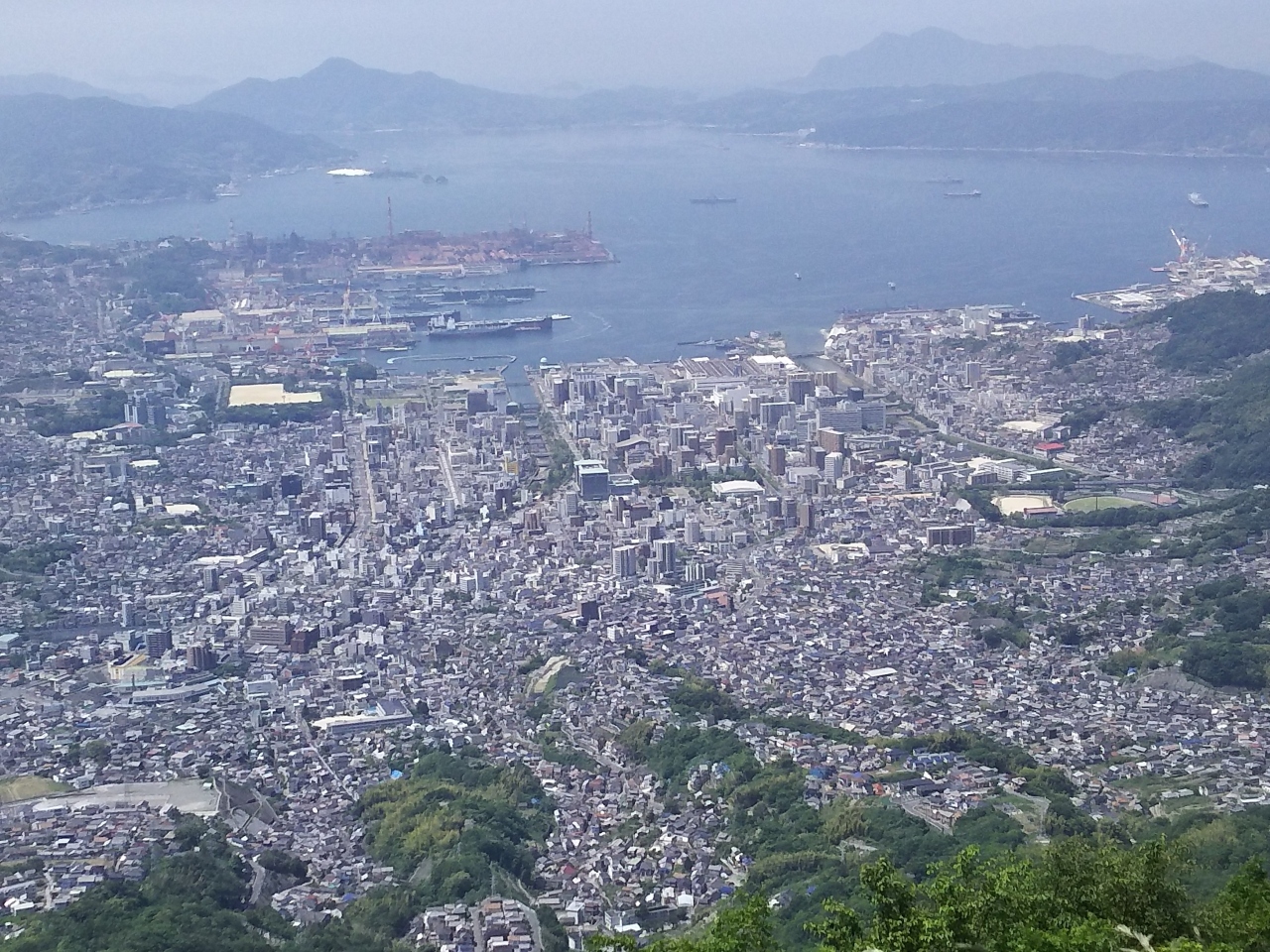 JR呉駅を出ると、正面に標高737mで、頂上に丸く白いレーダー施設がある灰が峯が見えます。地元の学校の遠足など徒歩で登る人も多いですが、車でも簡単に登れます。県道174号線、神山峠から200mあまり東から車道が頂上まで続いています。道は狭いですが、所々に離合する場所があり、頂上には数台の駐車が可能です。頂上からの展望は素晴らしく、眼下に呉市街と江田島、遠くには広島の町や四国山脈をのぞむこともできます。かつての軍港である呉港に浮かぶ船も見えます。夜景も素晴らしいです。