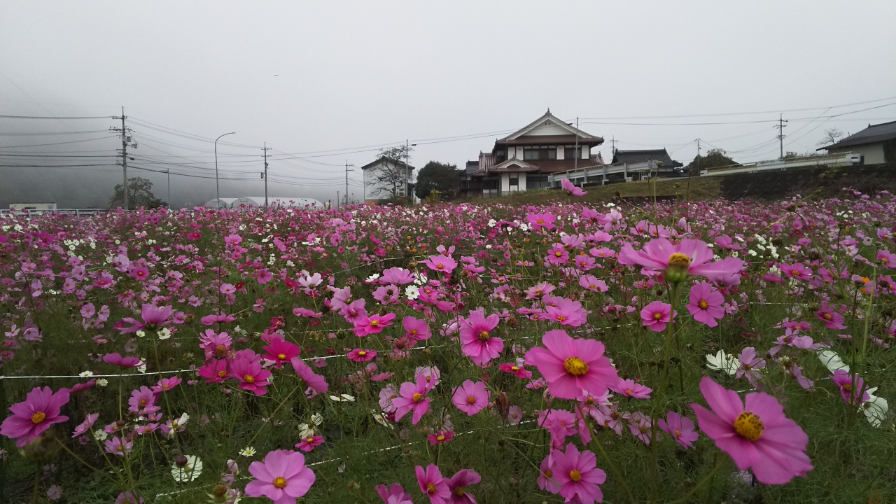 広島県呉市から三次まで国道375線を走るときには、食事とトイレ休憩、弁当の購入などで必ず立ち寄っています。駐車場が広く、小さな食堂のほか産直市があり、ファミリーマートには小さなイートインコーナーもあります。10月に立ち寄ったときには、ファミリーマートの横の庭には沢山のコスモスの花が植えられていました。