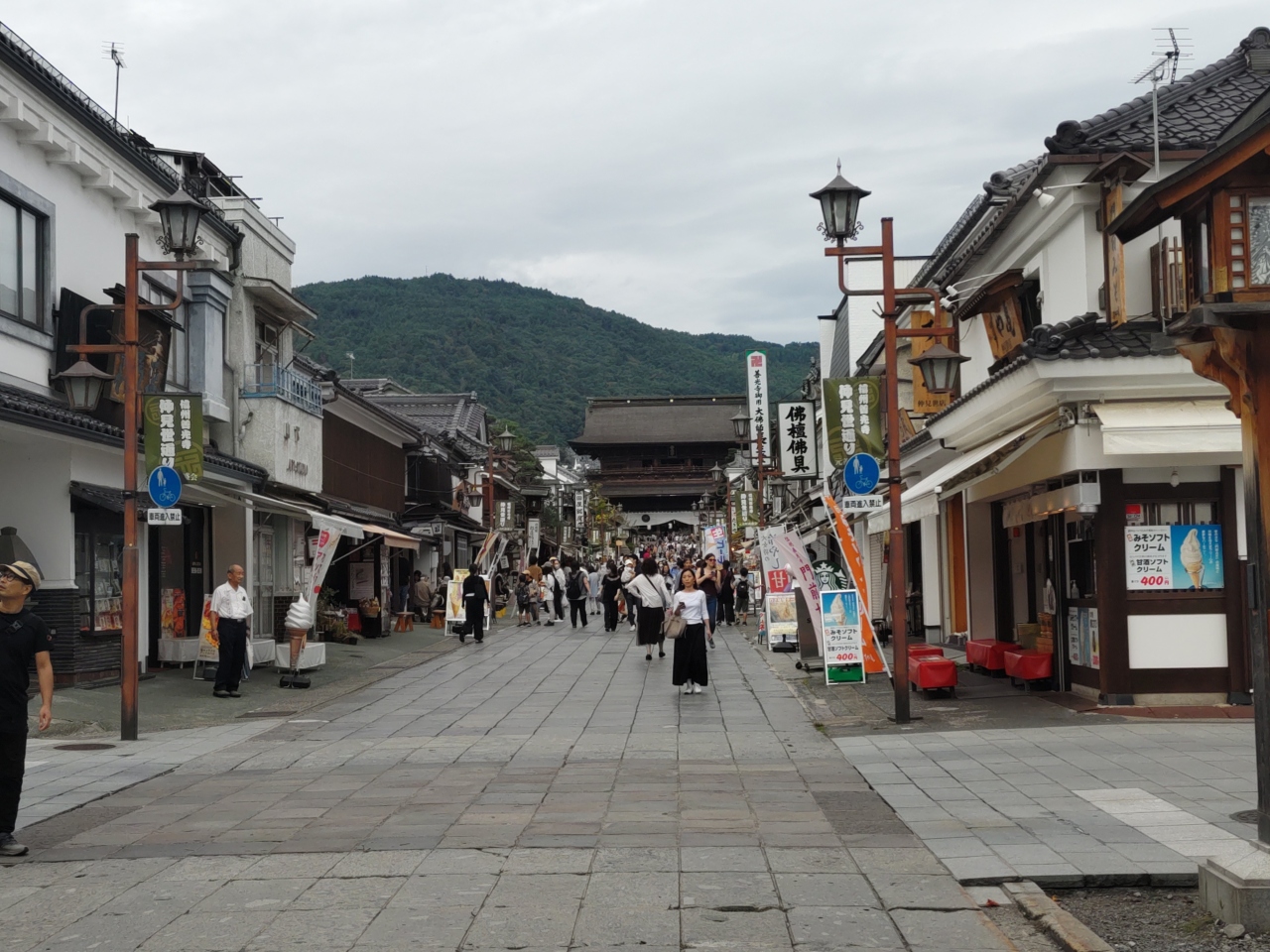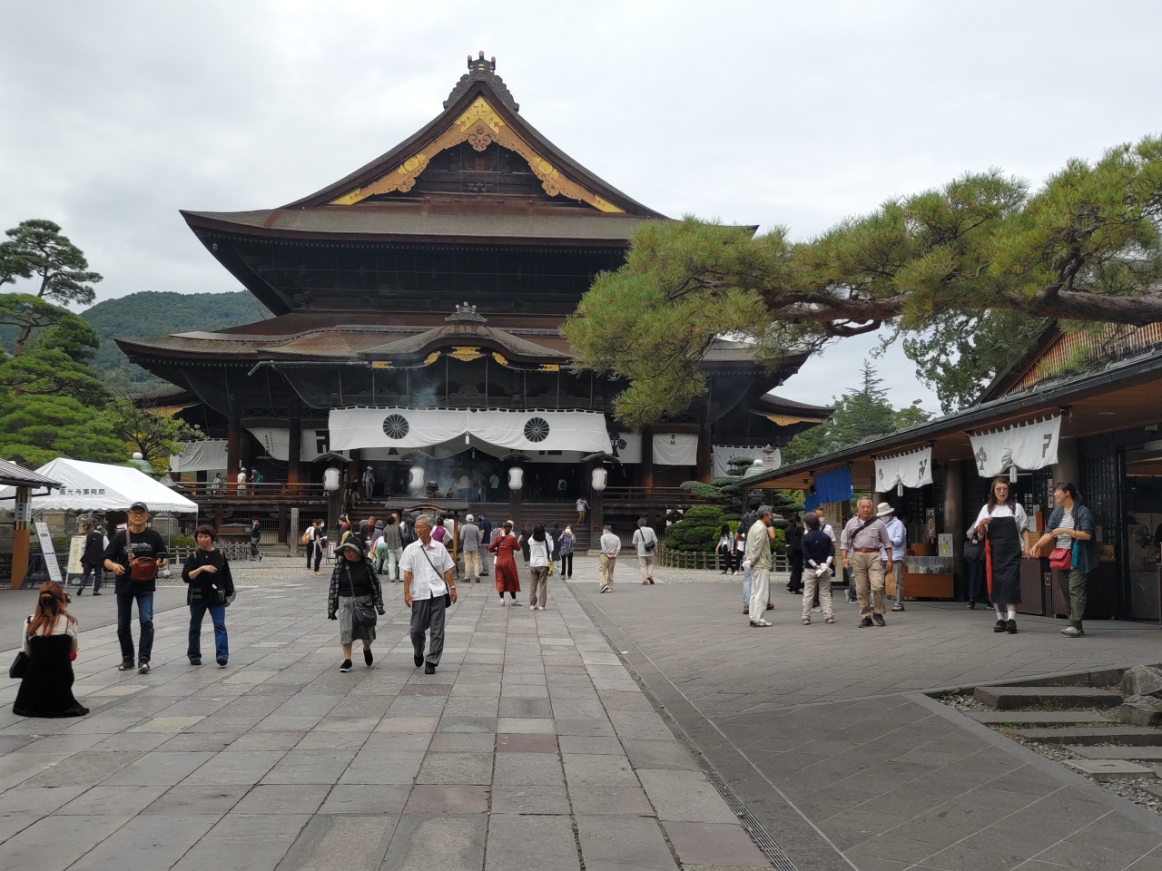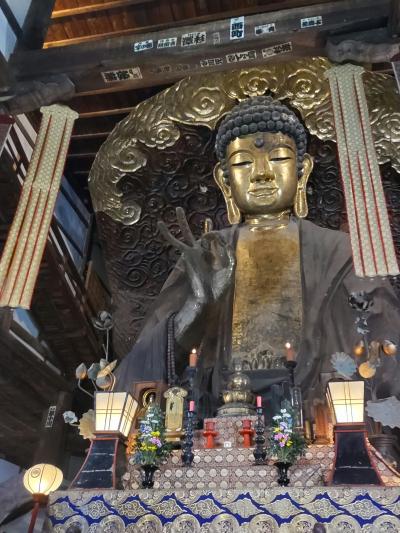 善光寺は、今から約1400年前に創建され、「阿弥陀如来と縁を結ぶことで極楽往生がかなう」とする善光寺信仰の中心である。今回は、およそ30年ぶり3度目の参拝である。JR長野駅善光寺口①番バス停から数分間バスに乗って、大門バス停で降りて参道を歩いた。緩やかな坂道を登って仁王門をくぐって、仲見世通りを少し歩くと右奥に世尊院の建物が見え、さっそくお参りに行った。幸いにも本尊の等身大「銅造釈迦涅槃像」(国重要文化財)の特別拝観日だった。その後、六地蔵、ぬれ仏に手を合せたのち、国重要文化財の山門をくぐり、国宝の本堂の前に出た。高さ約26m、間口約24m、奥行き54mの大伽藍に圧倒された。本堂内は、多くの外国人を含め参拝者であふれていた。