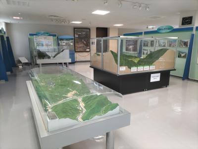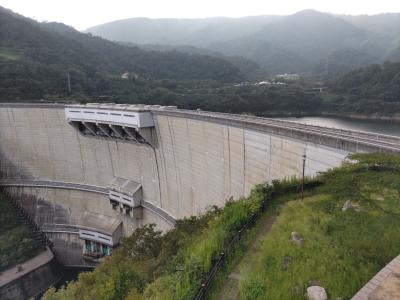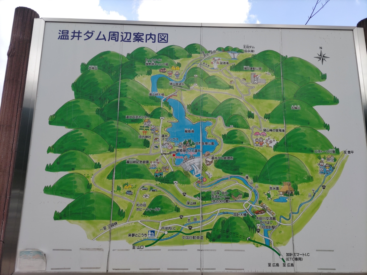 温井ダムは、広島市を流れる太田川の上流域にある大きなダムである。アーチ式ダムの高さ156mは、富山県の黒部第4ダムの186mに次いで日本第2位である。広島方面から国道186号を走り、温井スプリングス付近から左にそれて少し走るとダム記念広場の駐車場(66台)に到着する。ここから歩いて、長さ382mの堰堤を渡る。ダム湖の龍姫湖に山々の緑が映えてとても綺麗だ。堰堤を渡ったところに管理事務所のビルがあり、3階は資料室と展望デッキがある。エレベータ(自動運転)で地下に下り、岩盤をくり抜いた地下トンネルを歩いてダムの下まで降りる。見上げるとスケール抜群だ。前回訪れときはちょうど放流中だったため、もの凄い轟音だった。国土交通省所管のダムで、見学料無料である。