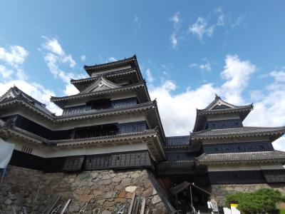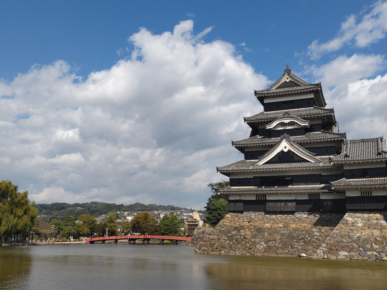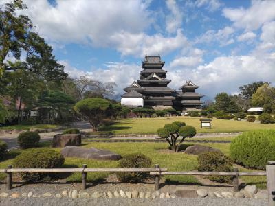 天守を見学の後、南側に広がる松本城公園を歩いた。西に歩いて、右に内堀に映る松本城天守はとても綺麗で絵になる。堀には多くの錦鯉が泳いでいて、幼い女の子と若い母親が鯉に餌をやっていた。「こんにちは」、笑顔で母子が爽やかな挨拶をしてくれた。綺麗な城を背景に、何かとても良いことにあったような気がした。公園内には所々にベンチが設置されていて、10数分休憩をした後に公園をあとにした。なお、松本城公園内は無料の区域である。