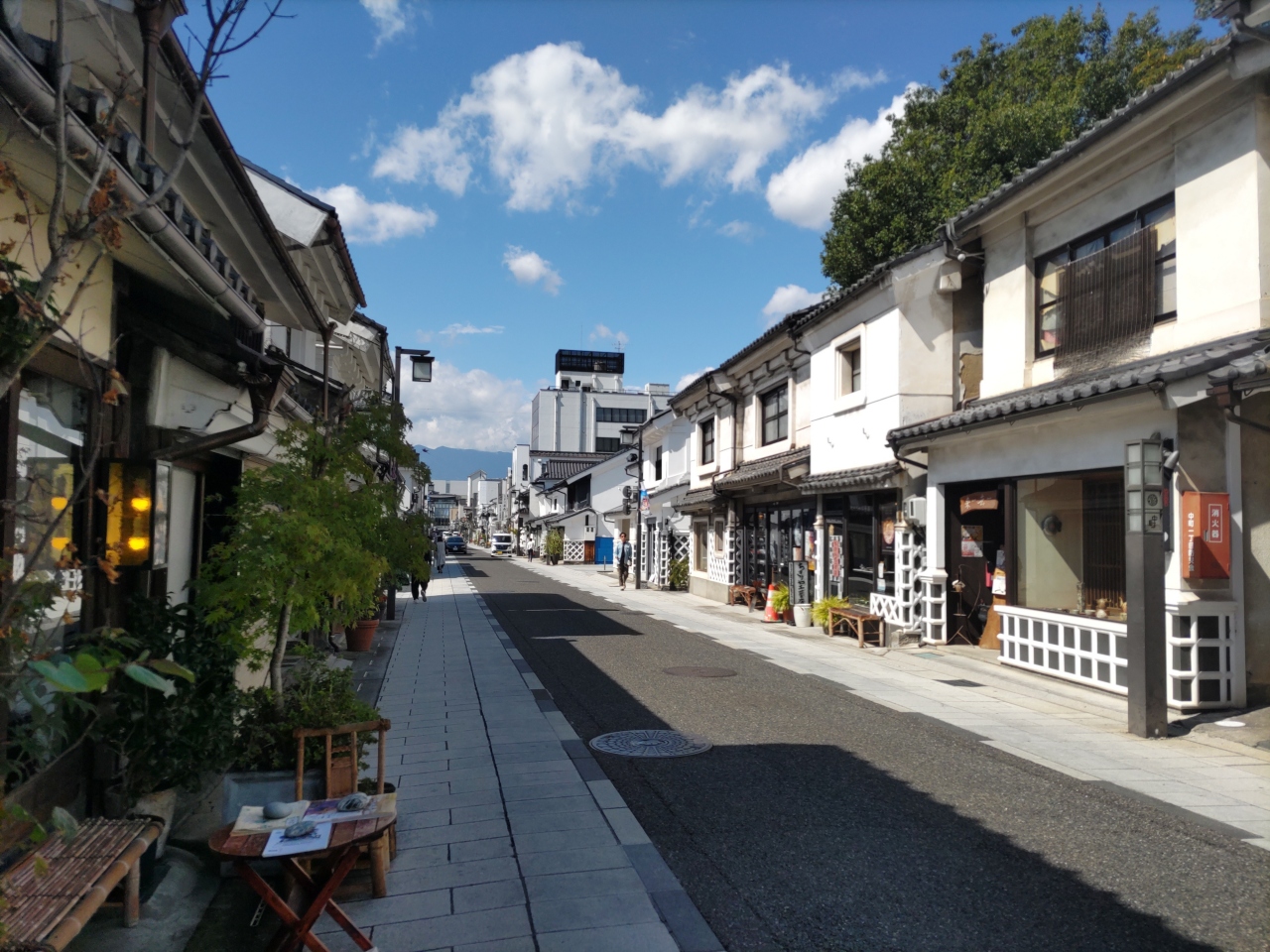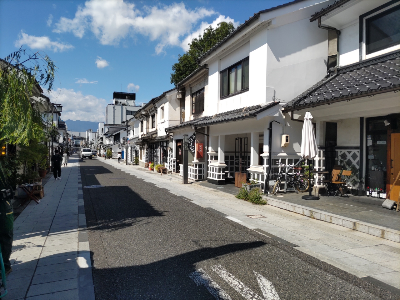 松本城見学の後、南に下って中町通りを歩いた。中町通りは東西300mあまり、白壁となまこ壁の土蔵が立ち並ぶ、古き松本の風景が広がる。江戸末期と明治に、一帯が大火に見舞われ、火災から守るために、「なまこ壁の土蔵」がつくられ、今に引き継がれているという。中心部に「蔵シック館」があり、付近には洒落たカフェや個性的な店が並んでいる。通りの東には松本市はかり資料館もある。なお、中町通りはバスや乗用車など比較的多くの車が走っているので、通行には注意が必要だ。