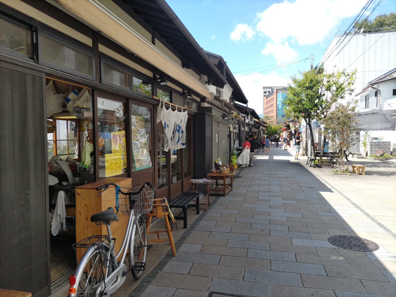 なわて通りは、松本城から南に歩いて5分あまり、松本駅から北東に歩いて10分のところにあり、個性的な小さな店が長屋風に軒を並べる商店街である。お洒落な雑貨屋や金物屋、花屋などが並んでいる。女鳥羽川の土手から始まった通りで、「縄のように長い土手」から「縄手」と呼ばれるようになったという。午前9時過ぎにはほとんどの店のシャッターが閉まっていたが、松本城観光の後に立ち寄ると若い女性をはじめ多くの観光客で賑わっていた。