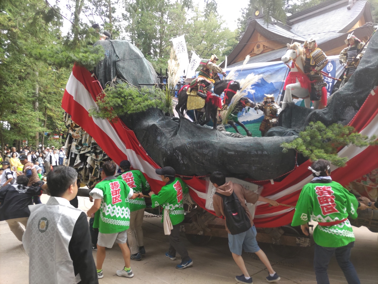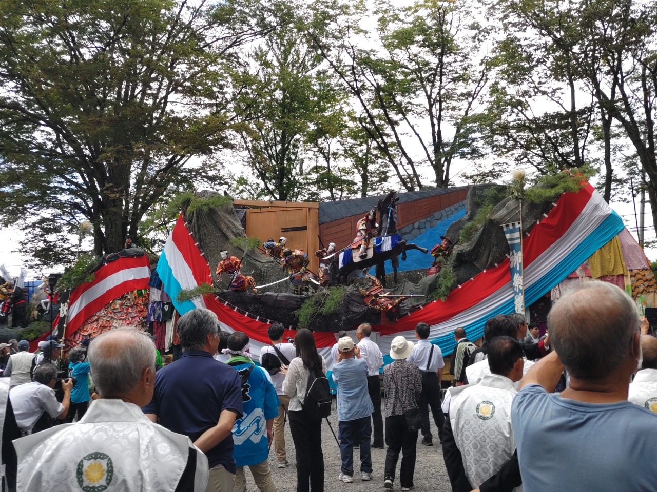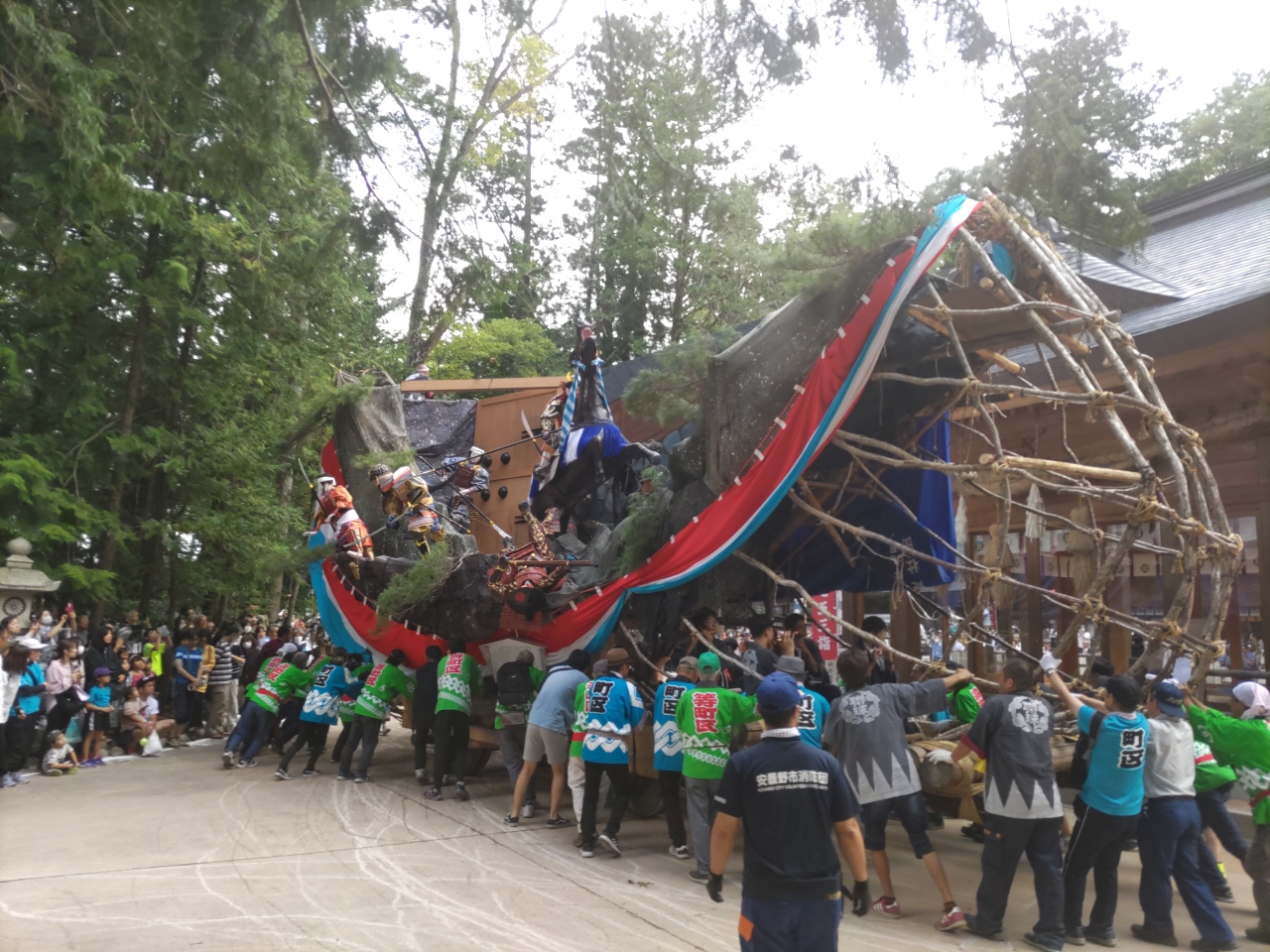 御船祭りは、毎年9月26日~27日に行われる穂高神社の例大祭である。9月27日昼過ぎに、松本駅観光案内所に立ち寄ると、スタッフから偶然にも穂高神社例大祭当日とのことを聞き、さっそく出かけてみた。午後2時過ぎに神社に着き、4時過ぎから舟形をぶつけ合うクライマックスを待った。孫悟空、三方ヶ原、安曇族のなどの大きな山車が用意され、太鼓や囃子の音が境内に響いていた。いよいよ本番では、大観衆の中、大きな山車同士を幾度もぶつけ合う迫力満点のイベントだった。なお、9月27日は安曇族の祖が白村江の戦いで戦死した日という。はるか昔に学校の歴史の授業を思い出した。