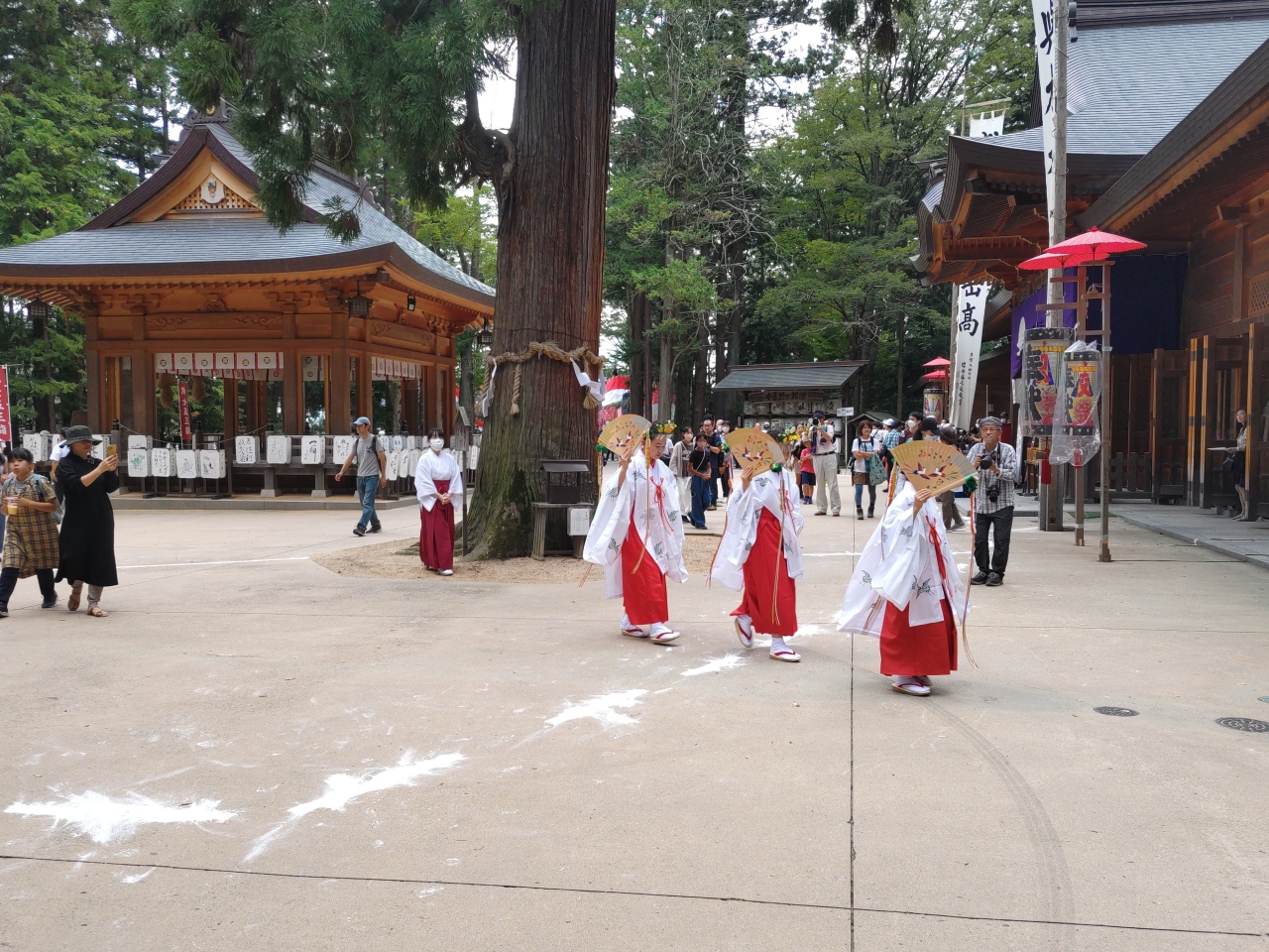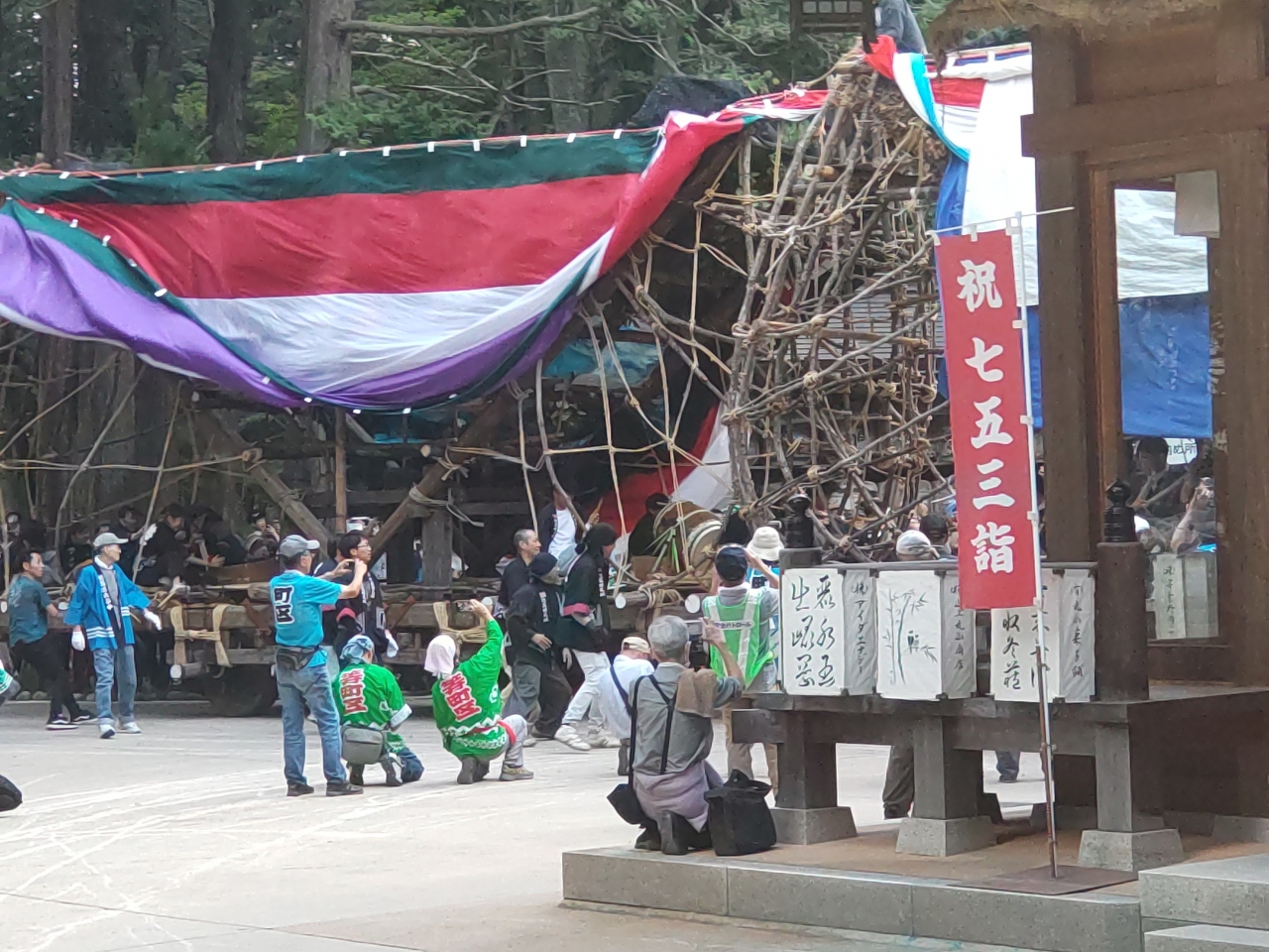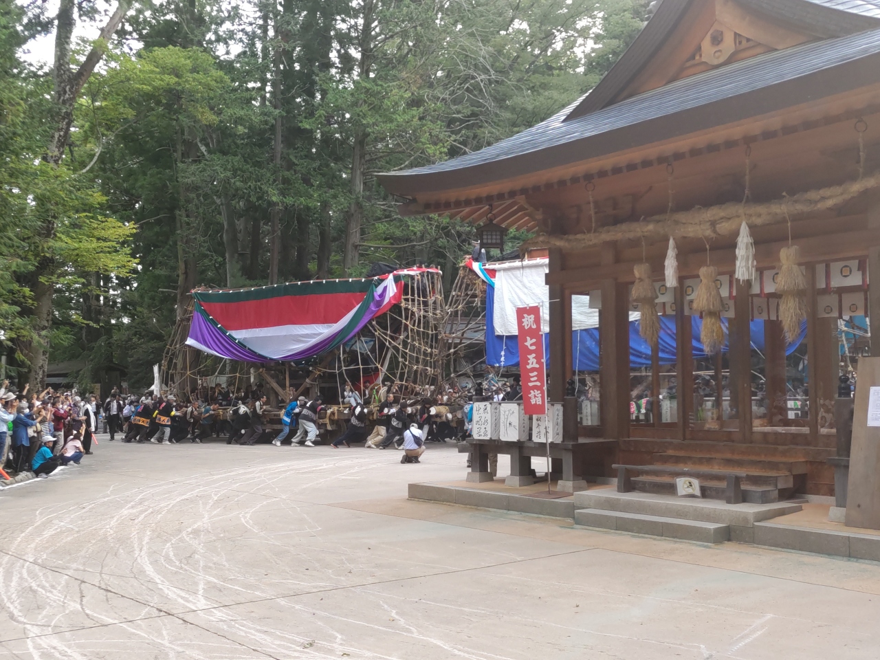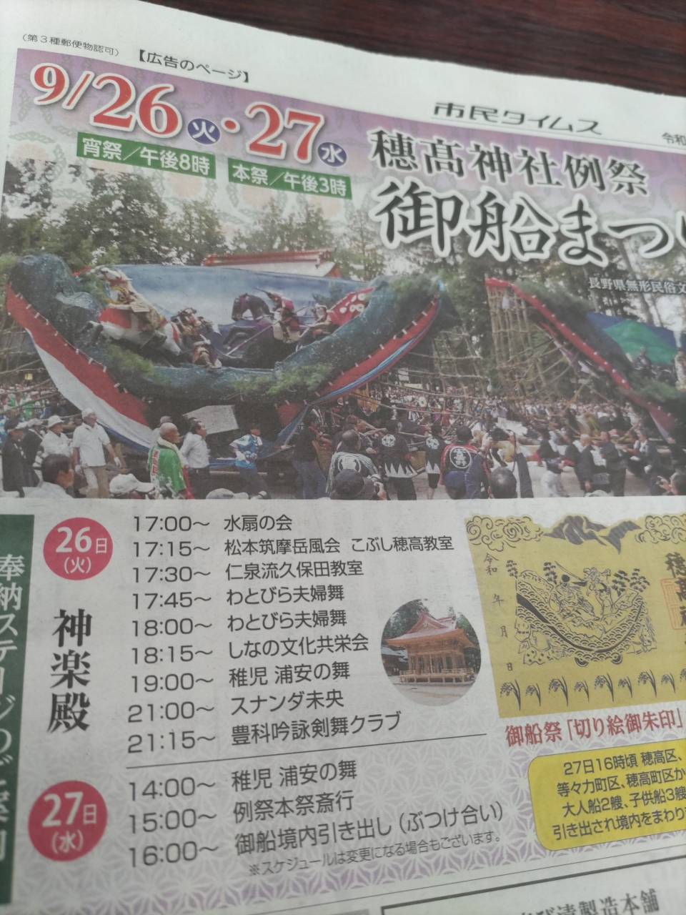 御船祭りは、毎年9月26日~27日に行われる穂高神社の例大祭である。9月27日昼過ぎに、松本駅観光案内所に立ち寄ると、スタッフから偶然にも穂高神社例大祭当日とのことを聞き、さっそく出かけてみた。午後2時過ぎに神社に着き、4時過ぎから舟形をぶつけ合うクライマックスを待った。孫悟空、三方ヶ原、安曇族のなどの大きな山車が用意され、太鼓や囃子の音が境内に響いていた。いよいよ本番では、大観衆の中、大きな山車同士を幾度もぶつけ合う迫力満点のイベントだった。なお、9月27日は安曇族の祖が白村江の戦いで戦死した日という。はるか昔に学校の歴史の授業を思い出した。