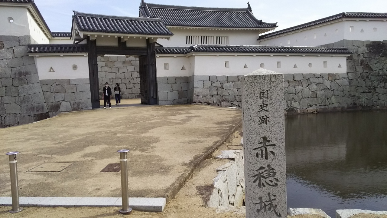 JR播州赤穂駅から南に約1㎞のところに赤穂城址があります。赤穂浪士で有名なので、是非一度訪ねてみたいと思っていました。赤穂市立歴史博物館前の赤穂公園東駐車場に車を停め、堀を渡って西に歩いて左折して、城門から赤穂城本丸庭園に入りました。天守閣や本丸の建物は残っていませんが、早春の日差しを浴びながら園内を歩きました。