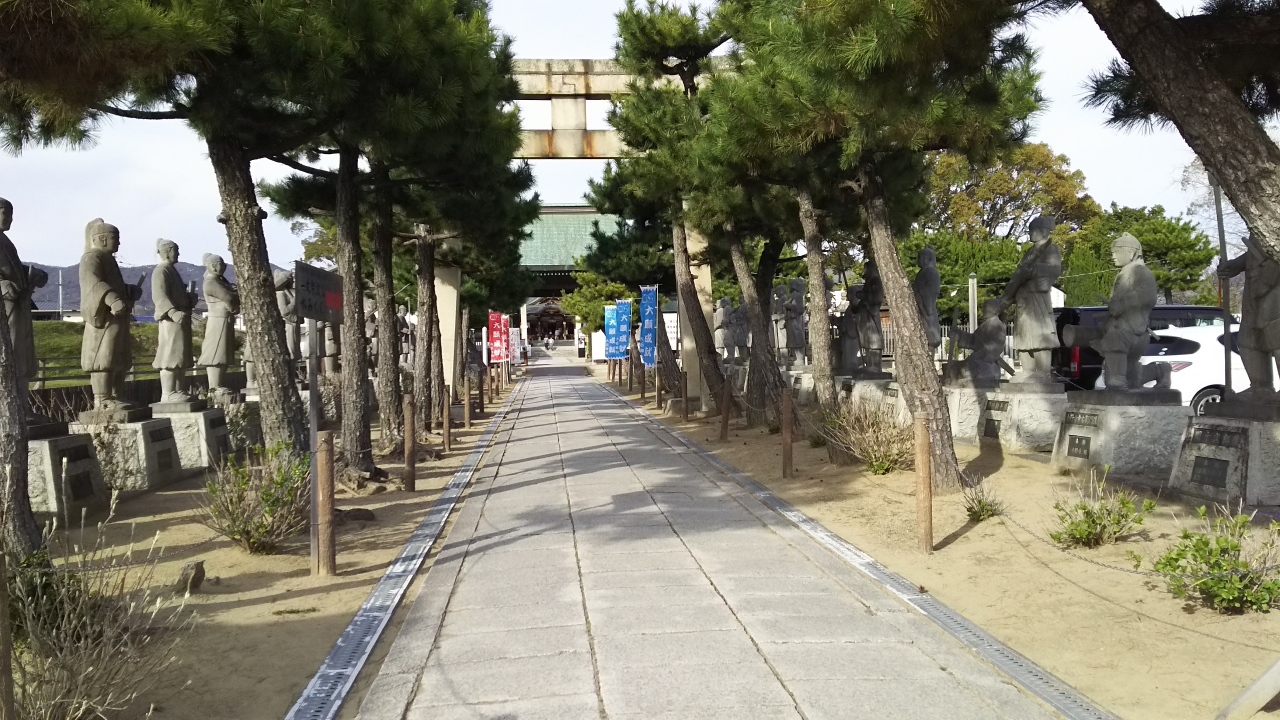 今治市の南、国道196号線を南下中に立ち寄りました。アカマツやクロマツなどが並ぶ広大な松原です。浜辺に出ると白砂の浜が広がり、国の名勝地でとても綺麗なところです。穏やか瀬戸内海のそよ風を受けながらひと時を過ごしました。松原の中心には菅原道真を祀る綱敷天満宮があます。道真公が大宰府の役人として左遷される途中、嵐のため志島ヶ原の入江に漂着したとき、村民が漁船の網を丸く敷いてもてなしたのが綱敷天満宮の由来だそうです。駐車場もあります。瀬戸内海沿岸にはほかにも兵庫県や福岡県など綱敷天満宮があります。