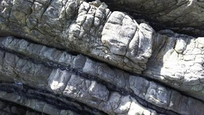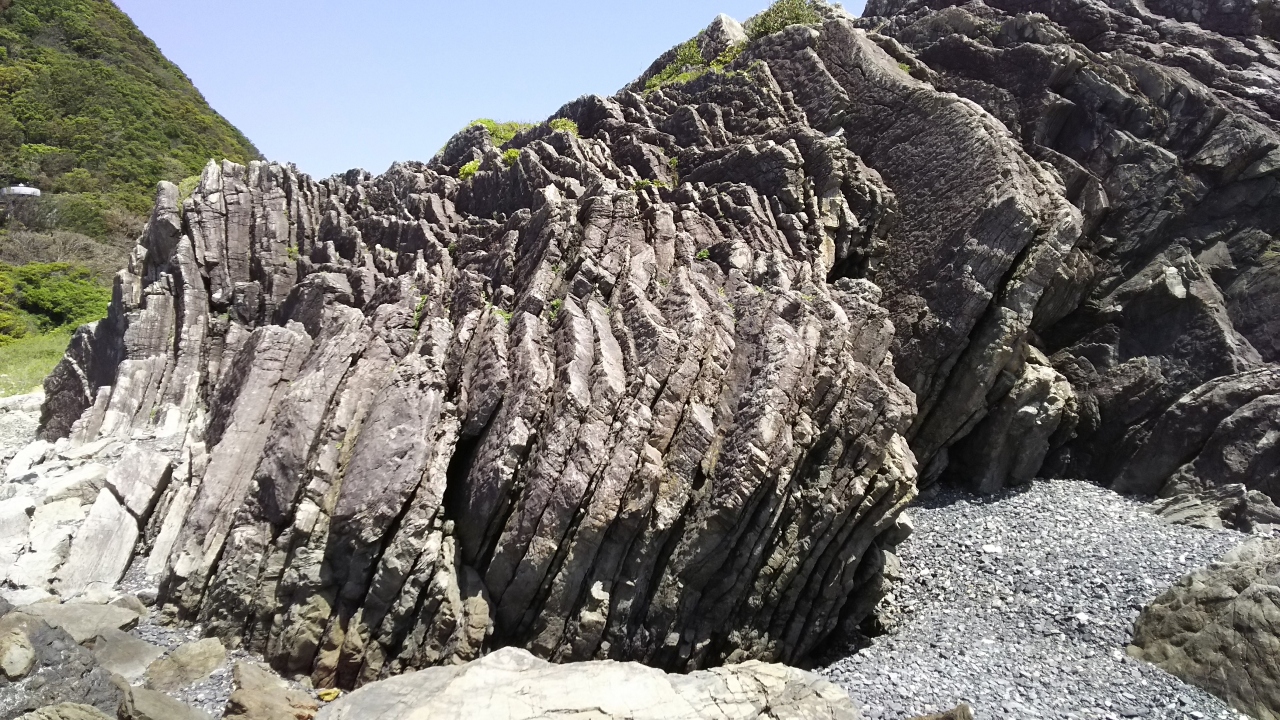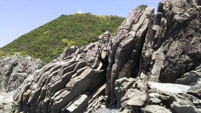 室戸岬の、荒波と岩の海岸の散策道を歩いた後、車で国道55号線を北東に10分あまり走ると、左手に室戸岬ジオパークセンターが見えたので立ち寄ってみました。建物に入ってまず室戸岬の地史や岩石の映像を見て、展示物や資料をスタッフの説明を聴きながら見て回りました。展示物等は分かりやすくまとめられており、数十分前に見てきた室戸岬の岩石や、四国の成因などについて理解することができました。