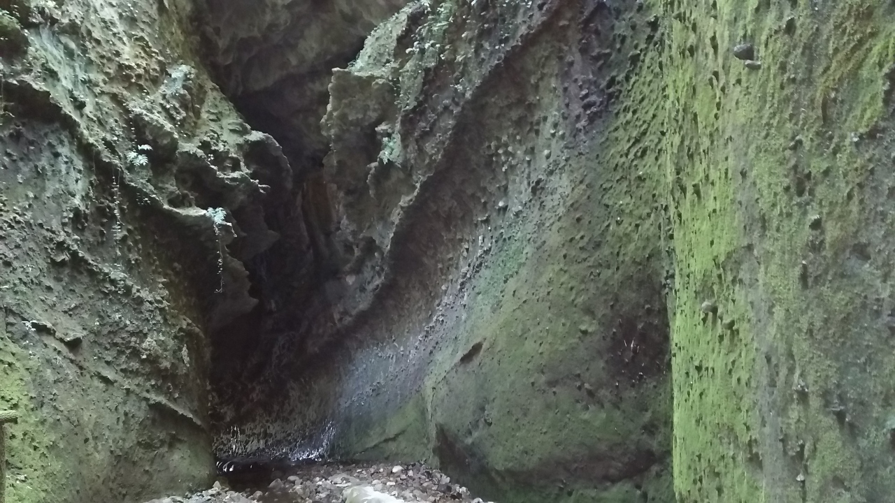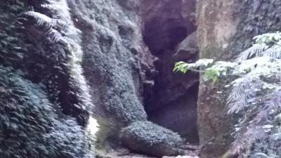 国道55号線、安芸市伊尾木を走っていると「伊尾木洞」の小さな案内板があったので、よってみることにしました。国道の右側に小さな観光案内書と駐車場があり、ここに車をおいて国道を横断して小さな水路の右の道を100mほど歩くと伊尾木洞の入口がありました。300万年前の地層が隆起し、それが波浪によって削られてできた海蝕洞です。シダの群落が見られ、ちょっと異様な雰囲気です。洞窟内を少し歩くと明るくなり、さらにシダのしげる道が続いています。国の天然記念物に指定されており必見です。でも一人で入ると不気味かも?