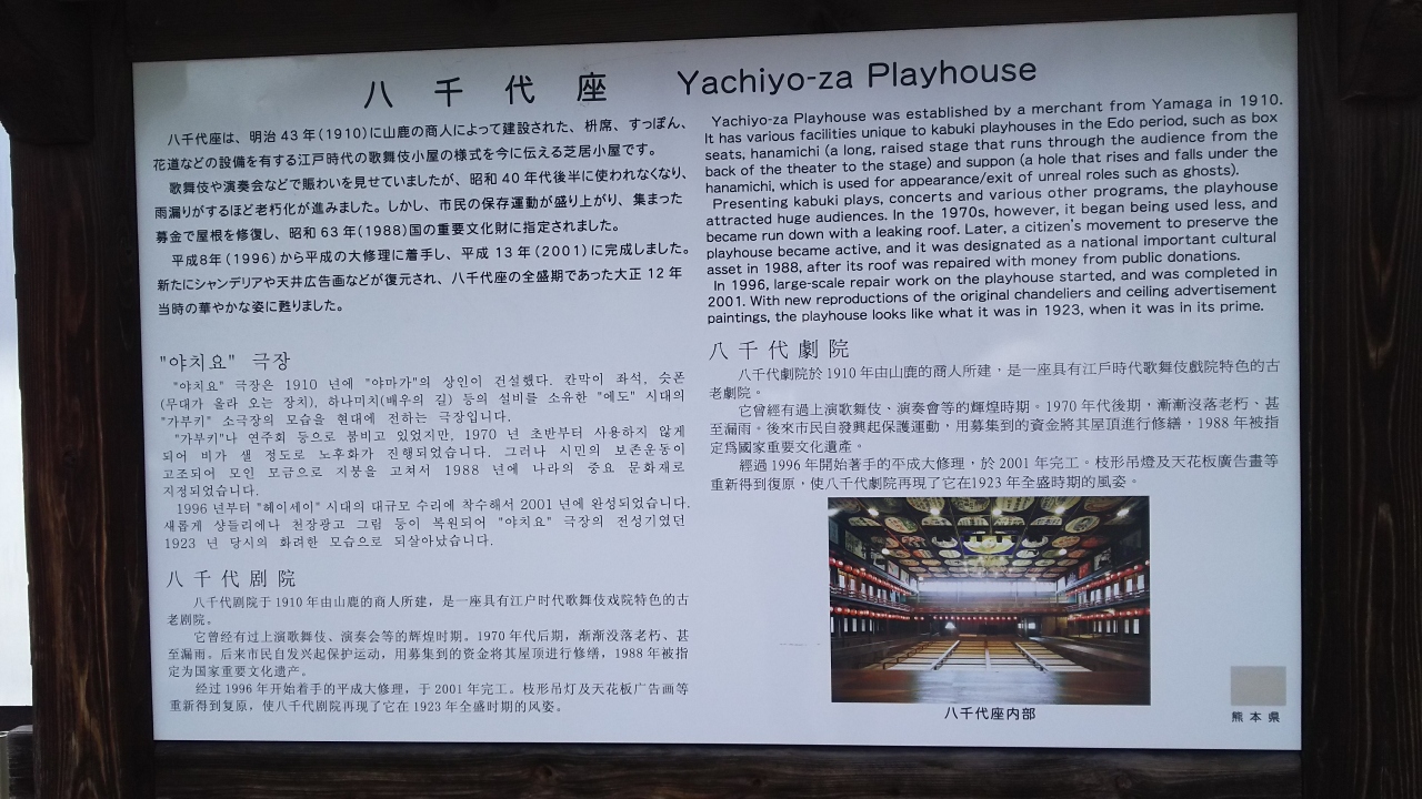 山鹿市の「温泉プラザ山鹿」ショッピングモールの駐車場に車をおいて、山鹿市を散策しました。八千代座通りを北に数分歩いて右折すると、左に八千代座が見えました。コロナ感染拡大のため入場することはできませんでしたが、概観から内部の雰囲気を味わうことができました。八千代座の前におられた観光ボランティアの方の説明によると、八千代座は明治43年に建設された芝居小屋で、一時は閉館していたが現在は国の重要文化財指定を受けて、平成13年から芝居小屋として生き続けているそうです。