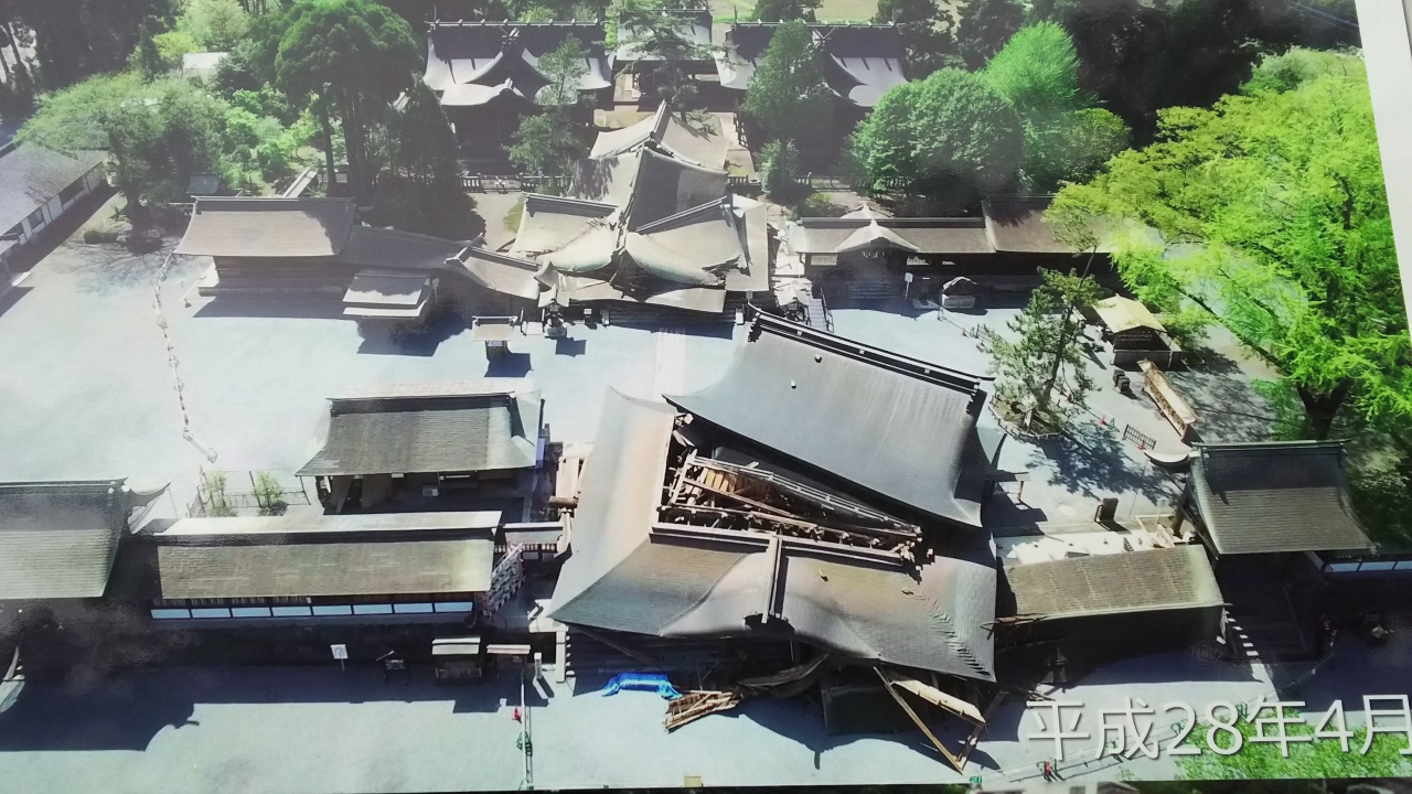 国道57号線を熊本から大分に向かう途中、阿蘇神社に立ち寄りました。阿蘇山の北麓のカルデラの中にある神社で肥後国一宮、全国に約450社ある阿蘇神社の総本社です。第一駐車場(無料)に車を停め、西に参道を歩きましたが、正面にある重要文化財の桜門は解体修理中で、桜門の大きな絵が描いてありました。復旧工事は令和5年までかかるそうです。左から回って境内に入って、再建工事が完了した拝殿を参拝しました。早期の全面復旧を願っています。