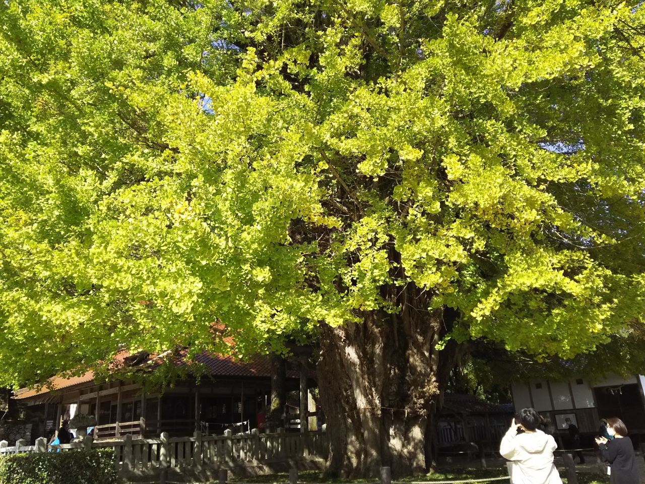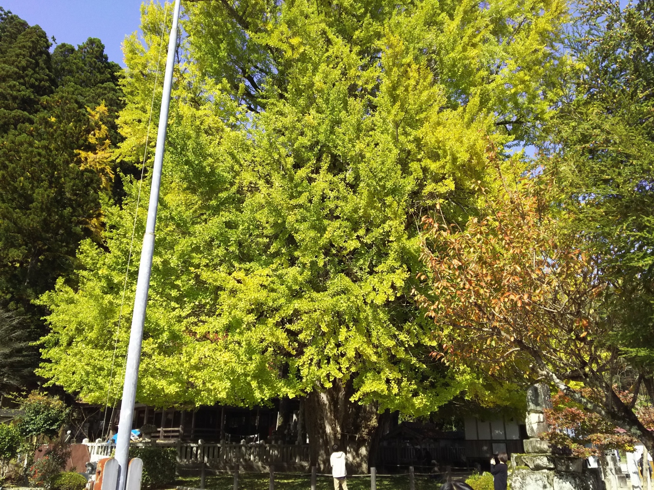 広島市街地と安芸太田町戸河内を結ぶ最短コースの途中にあるので、1年を通して度々ここを訪れていますが、やはり秋の紅葉時期が最も綺麗です。大歳神社の境内には何本かの大銀杏がありますが。最大のものは高さ48m、周囲8.2mに及ぶ巨樹で、推定樹齢1100年を超し、広島県の天然記念物に指定されており、圧巻です。駐車場は大銀杏の南側にあり(北側は筒賀中学の駐車場)、トイレもあります。