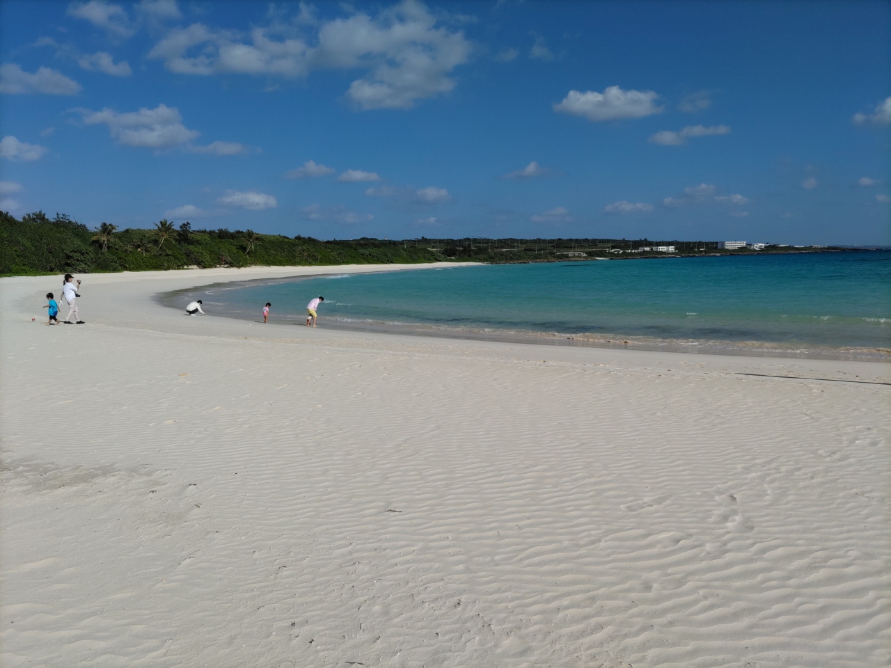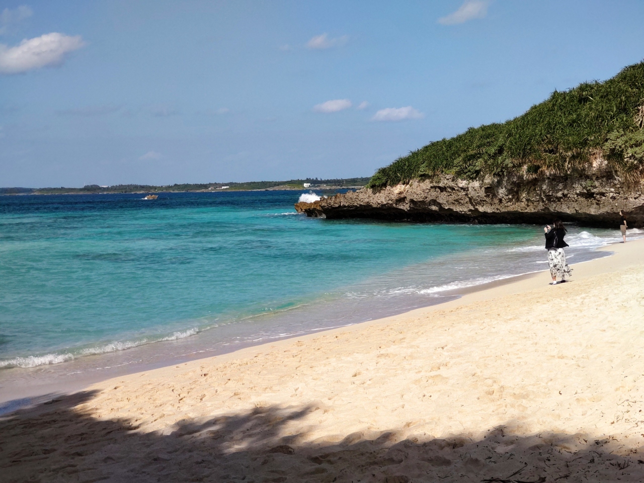 絶景が素晴らしく、爽快感抜群の伊良部大橋をレンタカーで渡り、伊良部島の南の県道204号を10分ほど走り、左に折れて直ぐのところに渡口の浜があった。ゆるやかなアーチ状の砂浜が青い海に映えてとても綺麗だ。浜の西端の駐車場には観光バスがとまり、小さな売店には多くの客が入っていた。