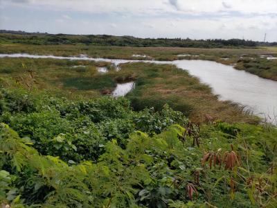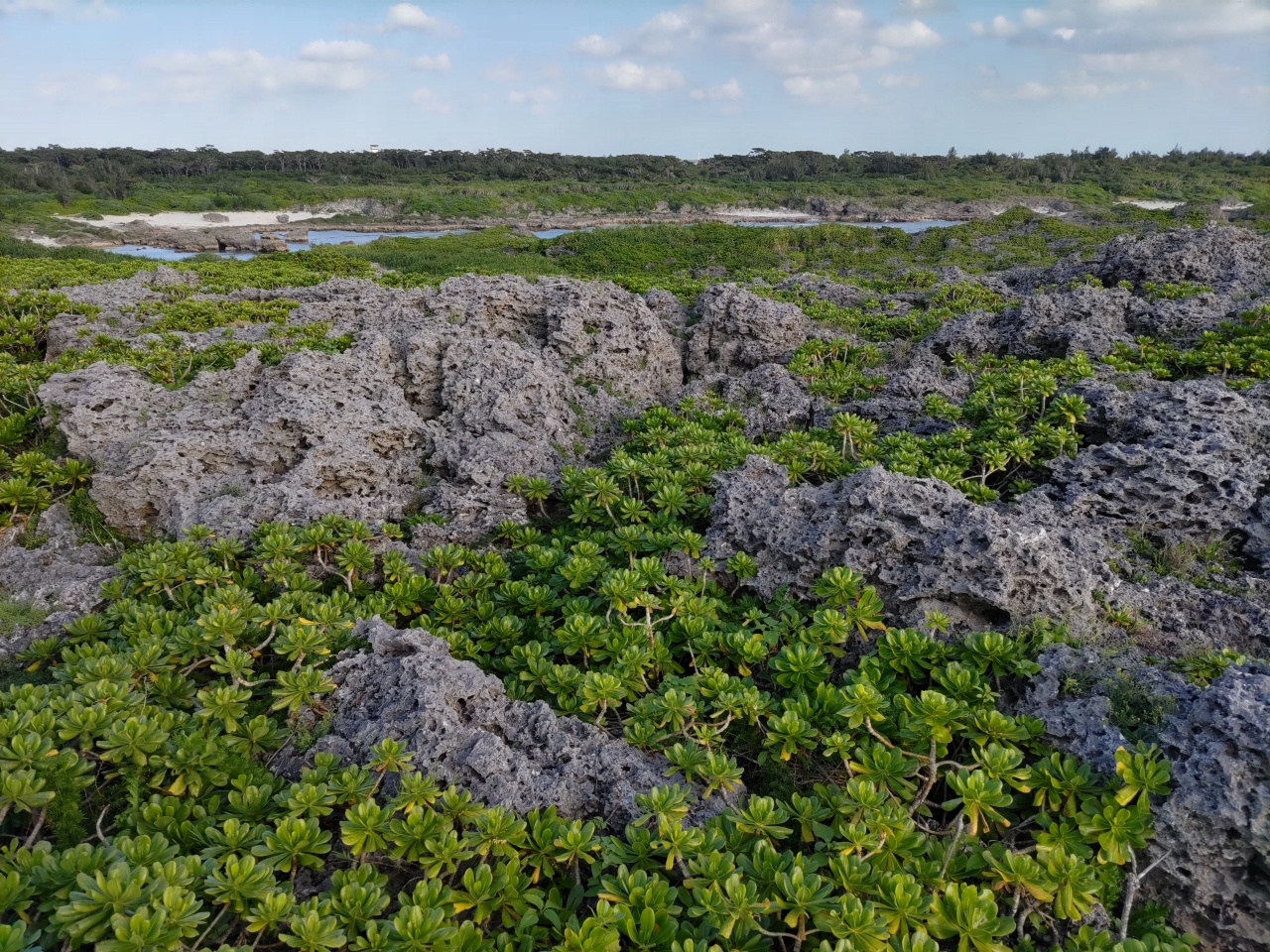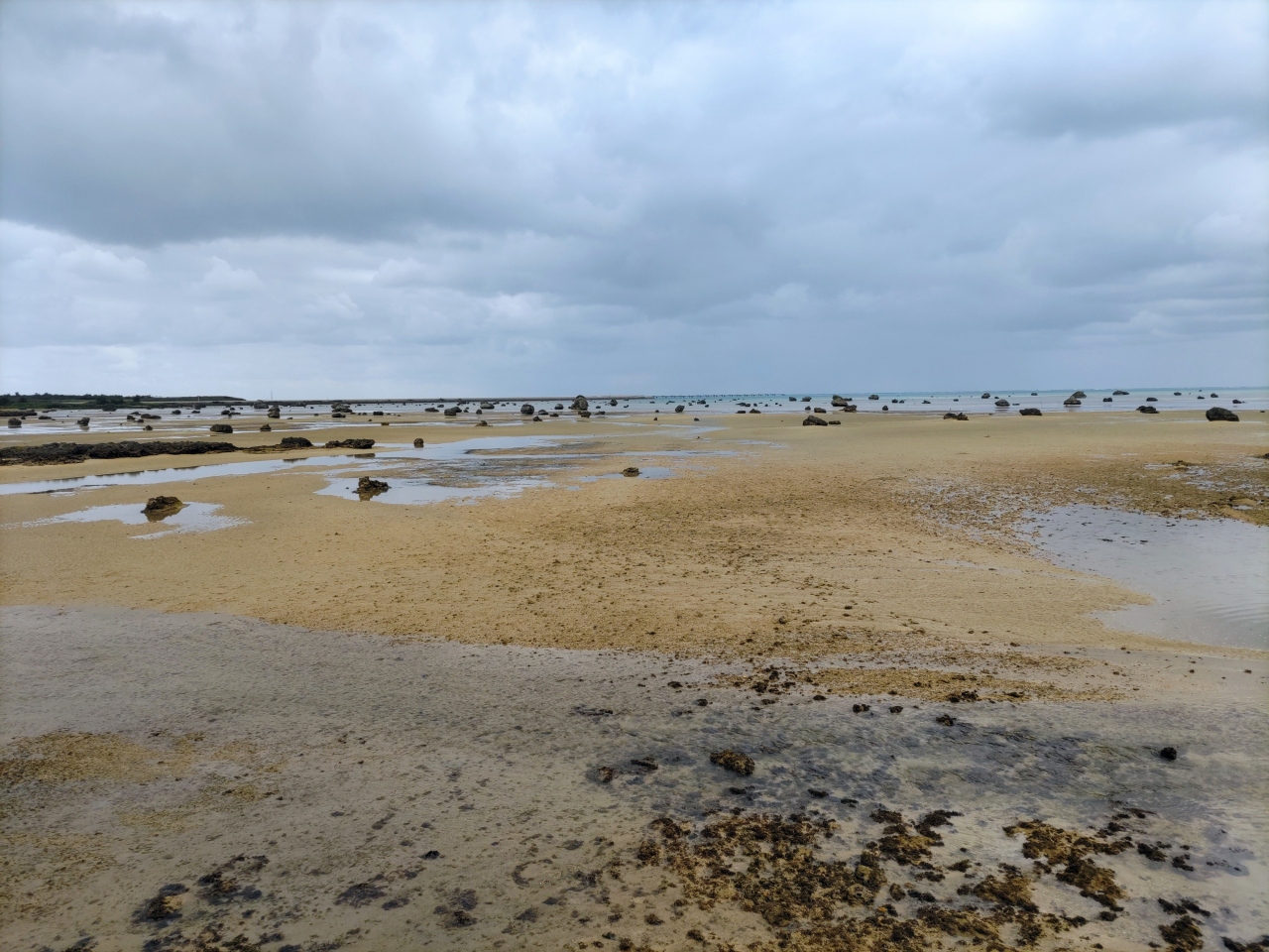 無数の巨岩群が点在する遠浅の浜で、独特の風景が見える。昭和の大津波で流れ着いた岩石群は独特の風景を醸し出している。通り池から車で移動しようと思ったが、間に下地島空港の滑走路があるため、渡口の浜付近まで引き返して、伊良部島と下地島の間の県道90号線を走らなければならなかった。