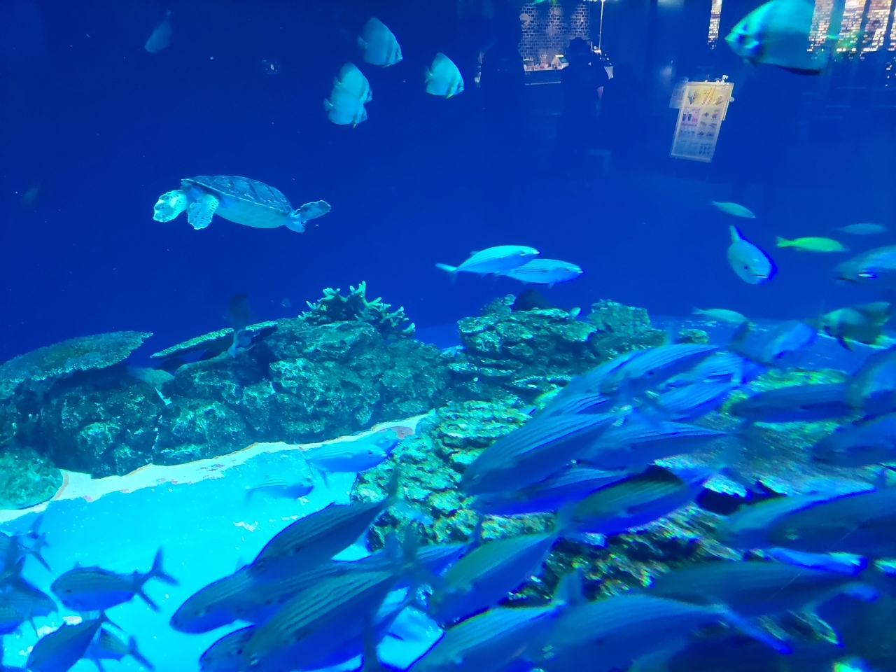 旭橋駅前の那覇バスターミナル前の停留所から路線バスで約40分、沖縄アウトレットあしびなーを過ぎたところに水族館がある。展示もなかなか工夫されており、水槽の中を泳ぐ魚類など内容は素晴らしい。水族館のポリシーとして水槽中の生物名は示さず、入館者はスマホで生物名や特徴等の説明を見るようになっている。入口では入場者がスマホのアプリをダウンロードしている姿が多く見られたが、内部ではスマホを見ている者はほとんどいない。スマホに示された写真をタップすれば良いのだが、写真が小さく、生物の見る角度が写真と異なるのでなかなか該当の生物が見つけられず、時間がかかるので私も途中からスマホを見なくなった。水槽の前にせめて生物名だけでも示すべきと思った。
