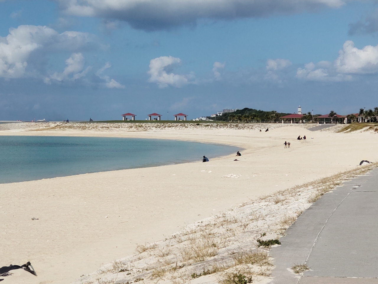 かりゆし水族館から歩いて数分のところに公園があり、その西には数百mにわたってビーチが続いている。観光客はほとんどいなく比較的静かな公園で、心地よい潮風を受けながら、ゆっくりとした時間を過ごした。地元の少年たちがビーチバレーを楽しんでいた。眼前に青い海と青い空、潮風が心地よい。那覇空港に着陸する航空機が絶え間なく、左から右に飛行しており、その動画を撮影している女性がいた。