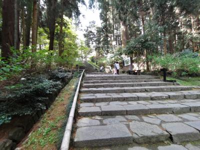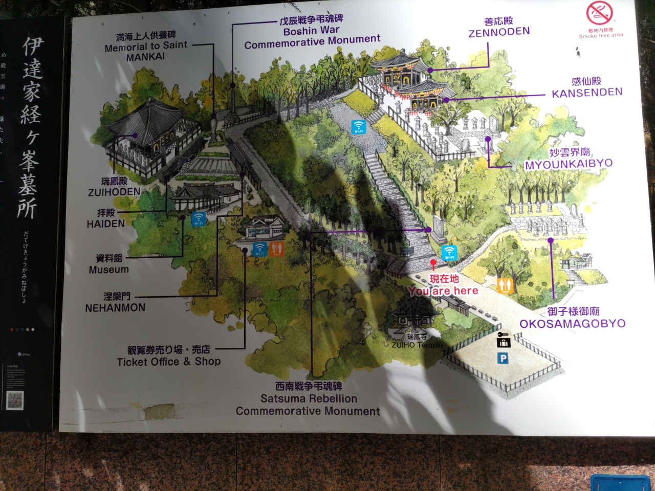 るーぷる仙台のバス停から、杉木立の緩やかな参道を5分あまり登っていき、左折して石段を登ると瑞鳳殿の受付、売店、トイレがある。入館料は570円だが、るーぷる仙台の一日乗車券を見せると460円となる。入口を入って左手の涅槃門の奥に伊達政宗の霊屋、瑞鳳殿がある。屋根には竜頭瓦、柱には獅子頭、極彩色で絢爛豪華、見事だ。次に、二代藩主忠宗、三代藩主綱宗をそれぞれ祀る、感仙殿、善応殿を訪れてバス停に戻り、降車して1時間後のバスに乗車して仙台城址に向かった。