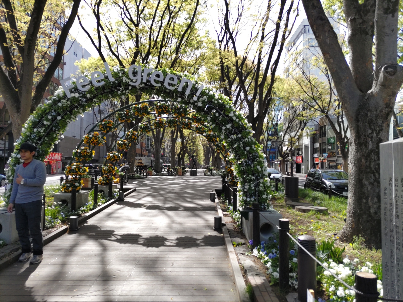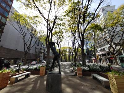 るーぷる仙台の「せんだいメディアテーク」バス停で降りて、定禅寺通りのケヤキ並木を歩いた。約700m続く道路の中央の遊歩道のまわりには、「夏の思い出」などの彫刻や花壇、ベンチが配されていてムード満点、絶好の散策コースである。4月の午後、近くのコンビニでコーヒーを購入し、ベンチに座ってゆったりとしたひと時を過ごした。毎年12月に行われる「SENDAI光のページェント」では、ケヤキの木が美しいイルミネーションで飾られる。何年か前に訪れたときは、大変綺麗だったことが強く印象に残っている。