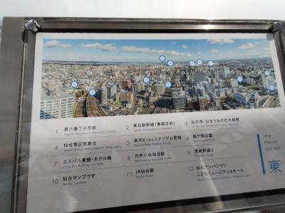 仙台駅西口の陸橋を北に歩いていくと、地上145.5mの再開発ビルのアエルがある。1998年の完成時点では東北地方で最高層のビルであり(現在第5位)、仙台市のランドマークとなっている。このビルの2階には明るく広い空間があり、その北にあるエレベーターに乗ると、地上31階の展望テラスに行くことができる。展望テラスは東西2つあり、そこからは仙台の素晴らしい眺望を楽しむことができる。エレベータホールからも北側の町が見える。無料である。