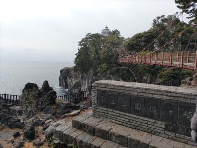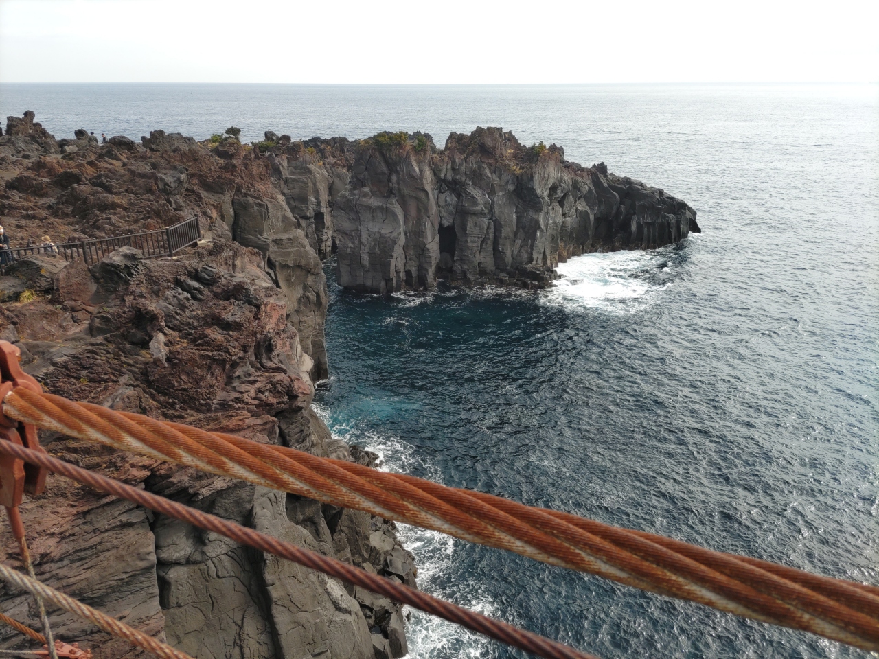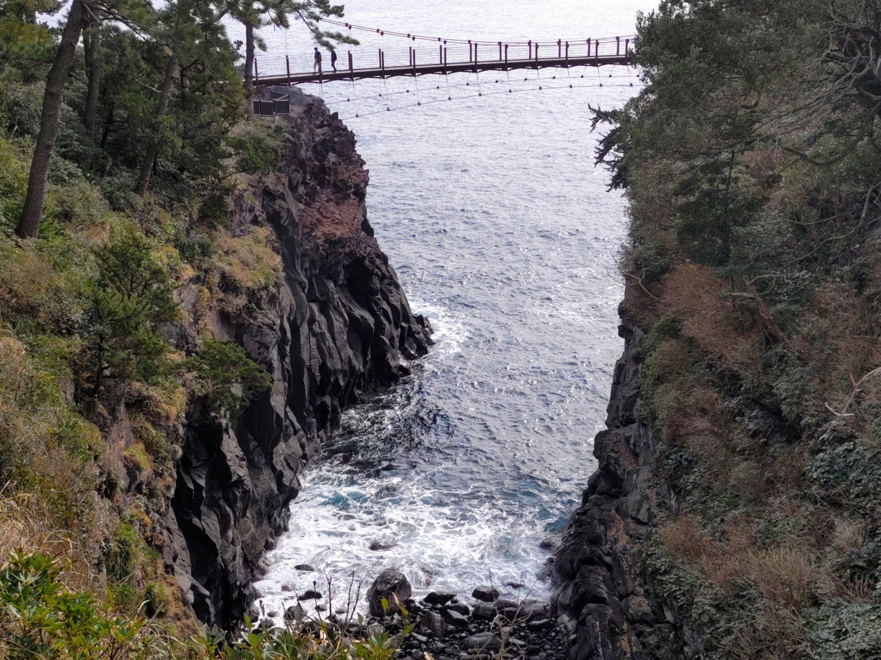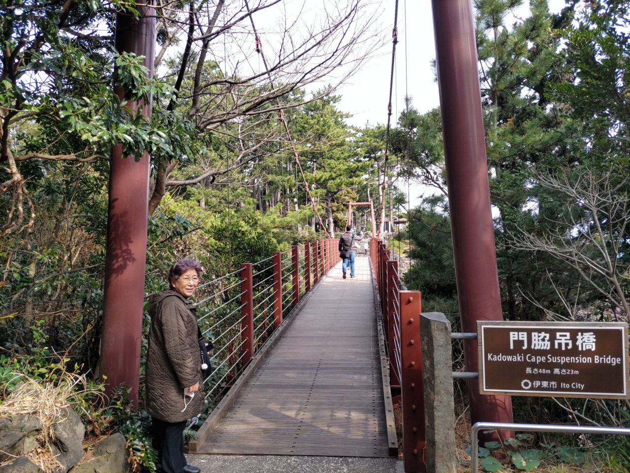 城ケ崎海岸の断崖絶壁に架かる高さ23m、長さ48mのつり橋。眼下に岩に砕ける白波と青い海が見渡せ、スリル満点だ。ハイキングコースは、つり橋を迂回することはできるが、つり橋の足元は頑丈な板張りで、他の人が前後に渡っていても揺れが少なく、意外と怖くはなかった。初めての方も是非挑戦して欲しい。