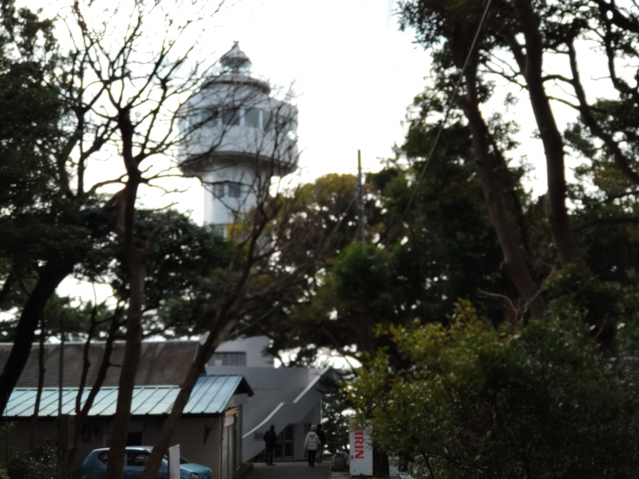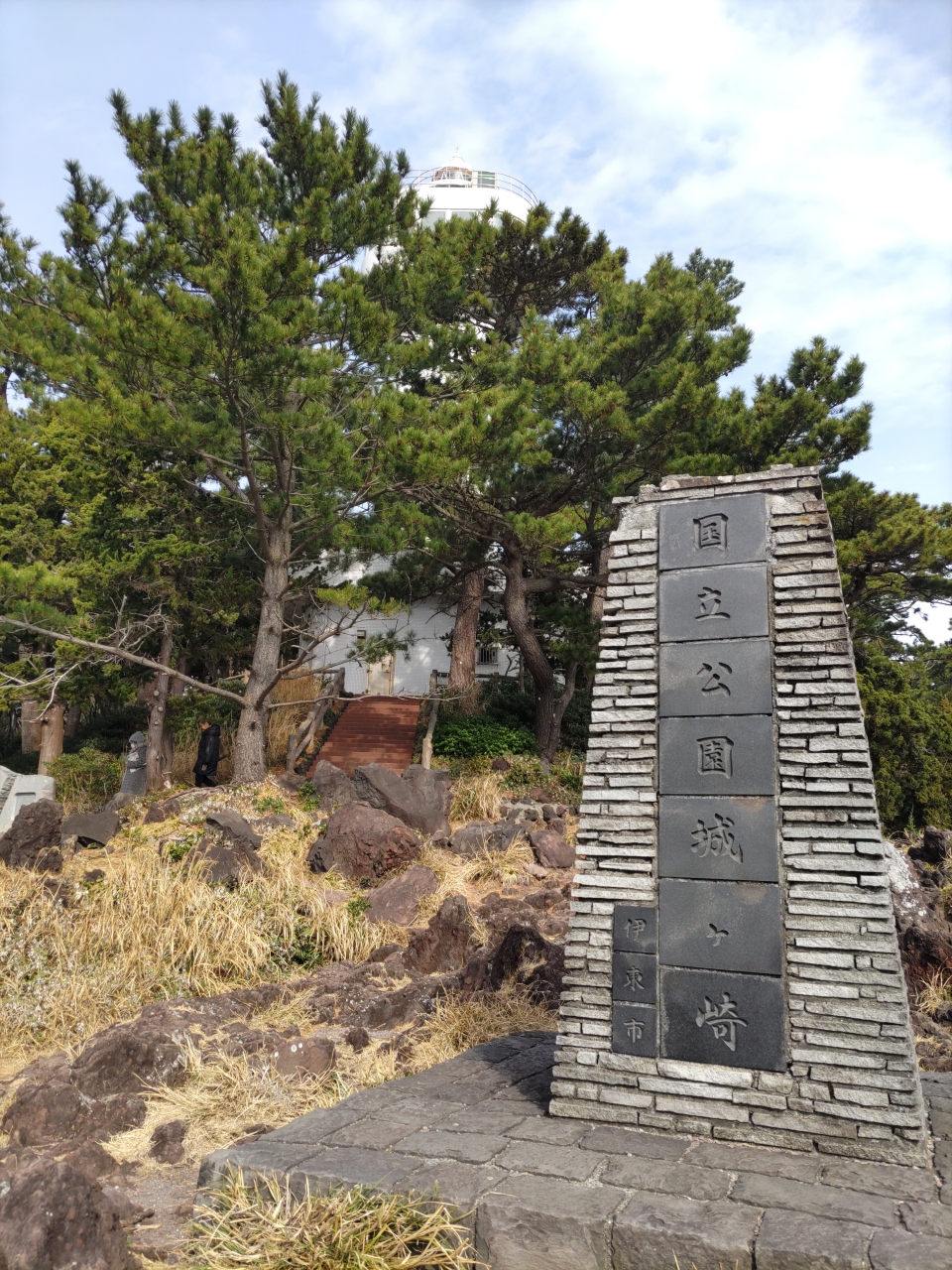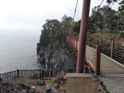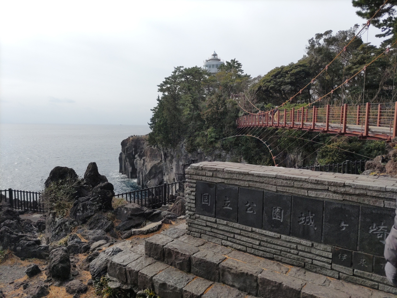 1960年に設置された、門脇つり橋のそばに立つ地上24.9mの灯台で、現在は伊東市の管轄で運用されているが、無料の展望台は一般公開されていない(ガイドブック等には公開と記載)。ただ、灯台の直ぐ下に灯台からと同じ景色が楽しめる展望所があり、そこから断崖絶壁と打ち寄せる荒波、青い海と伊豆大島を一望することができた。
