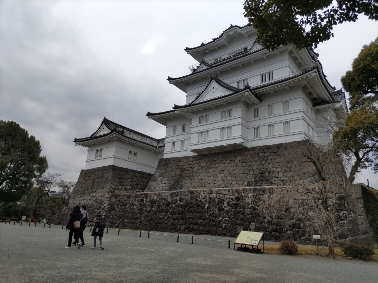 小田原城は戦国時代から江戸時代にかけての平山城で、北条氏の拠点であった。難攻不落・無敵の城と言われ、上杉謙信や武田信玄の攻撃にも耐えたが、豊臣秀吉の攻撃によって落城した。小田原駅東口からミナカ小田原の前を通って南下すると、旭丘高校前の交差点にでる。ここには、小田原城への地図の案内板があるが、正面口のコースが示されているので、時間的に余裕のない人は、この交差点を右折して西側から城址公園に入った方が良い。駅から徒歩約15分で天守閣前に到達する。