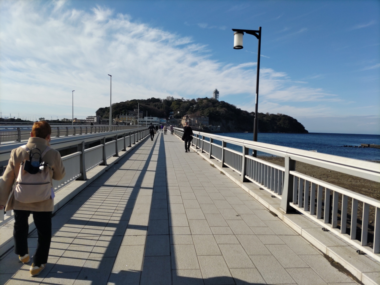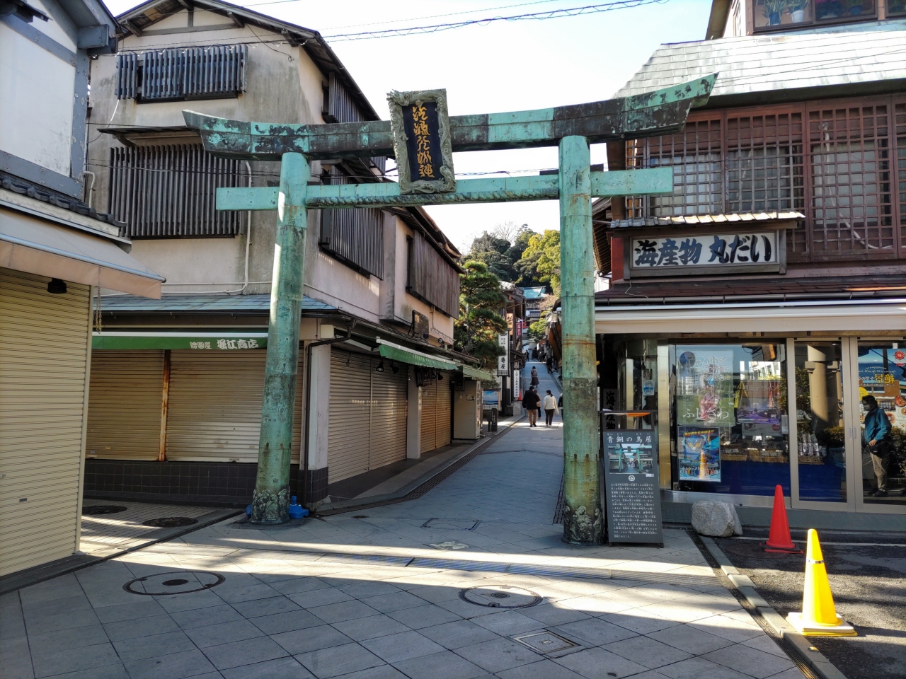 江の島は陸繋島である。陸繋島とは、砂州で陸続きになった島のことである。その意味で成因は、フランス西海岸にあるモンサンミッシェルと同じある。陸の片瀬海岸から砂州の上に江の島大橋がかかっている。江ノ島大橋の手前右側にトイレと江の島遊覧船の乗場がある。帰りは江の島岩屋から遊覧船に乗って帰ろうと思っていたが、あいにくその日は欠航だった。江の島に入って直ぐのところに、江ノ島神社の青銅の鳥居があり、さっそく史跡や景勝地に恵まれた、またパワースポットの江の島観光をはじめた。
