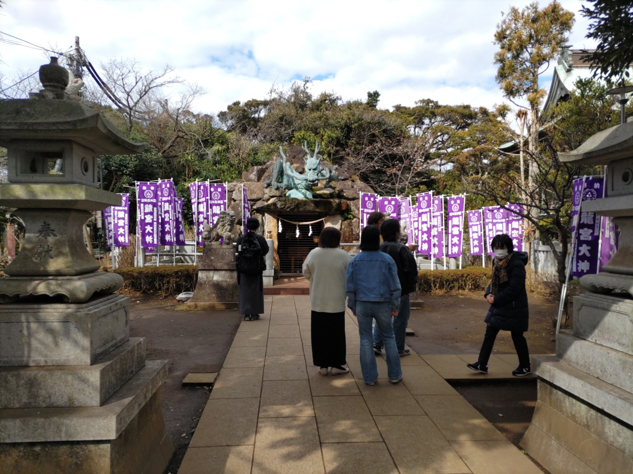 青銅の鳥居をくぐるり、土産物店が並ぶ緩やかな参道を登ると江島神社である。江ノ島神社は宗像三女神(広島の厳島神社と同様)と弁財天が祀られている。エスカー(有料エスカレーター)を使わずに階段を歩いて登り、辺津宮、中津宮、奥津宮と順に参拝して、江の島岩屋を見た後、御岩屋通りをレストラン江之島亭付近まで再び登って、そこから、中津宮までの登り道ではなく、山沿いの道を江島神社大鳥居まで下った。全行程約2時間、結構体力を要した。