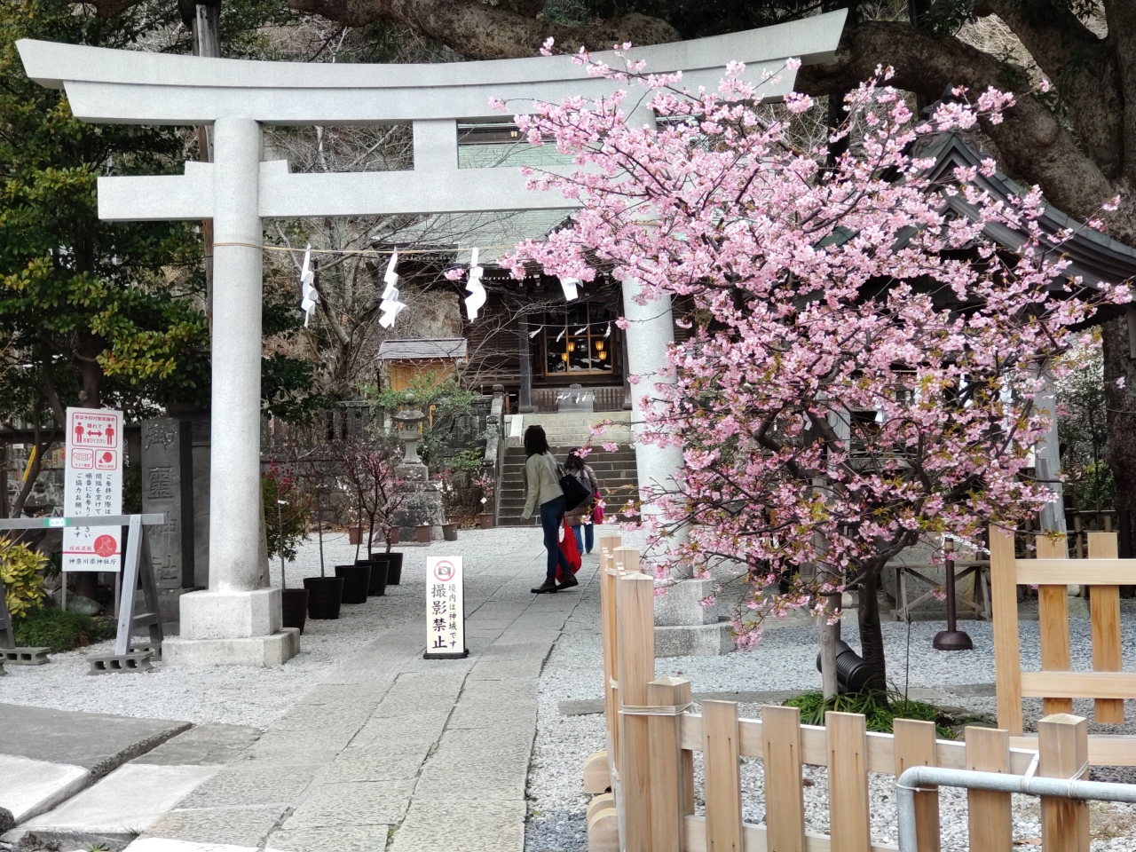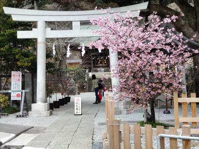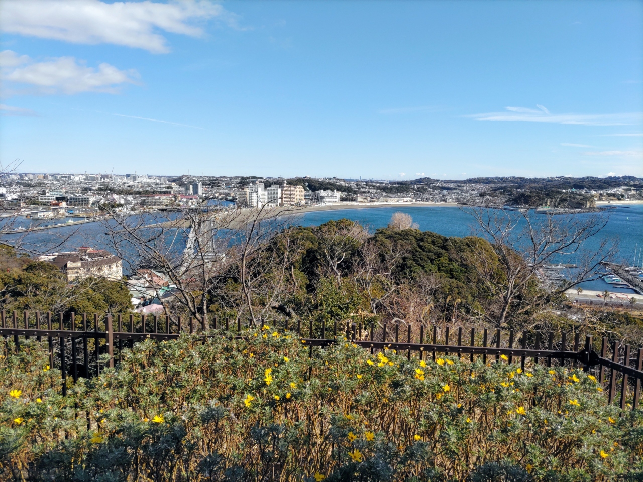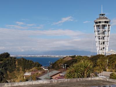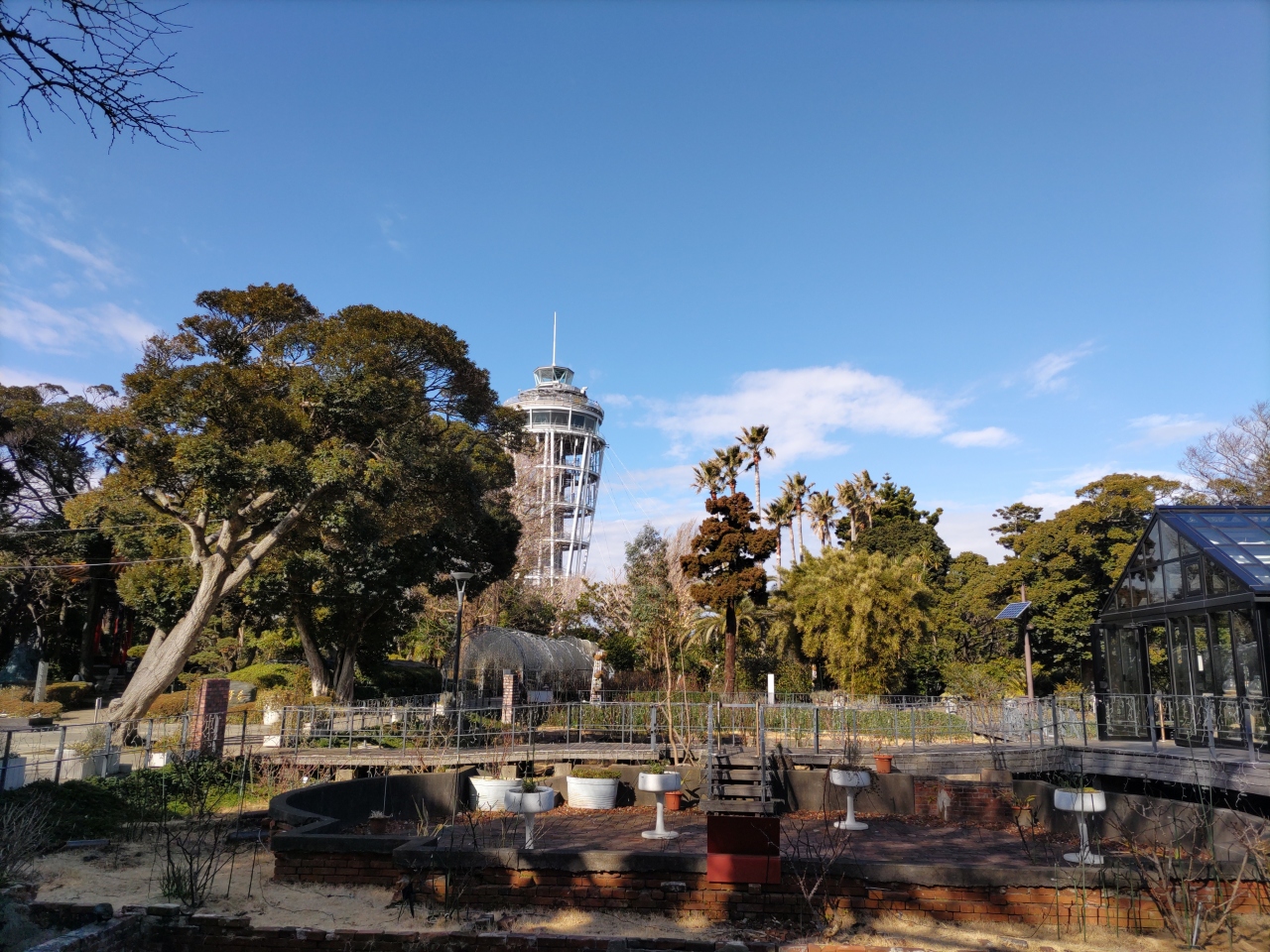 江島神社中津宮の西側は、江の島の頂上部分で比較的平坦、サムエルコッキング苑と南側には花壇と展望所がある。ちょうど河津桜が満開だった。サムエルコッキング苑内には展望灯台「江の島シーキャンドル」がある。入場料が必要だが、海抜約100mの高さから見る景色は素晴らしい。
