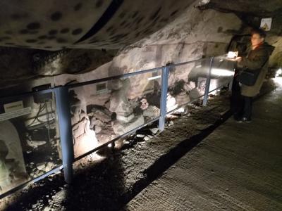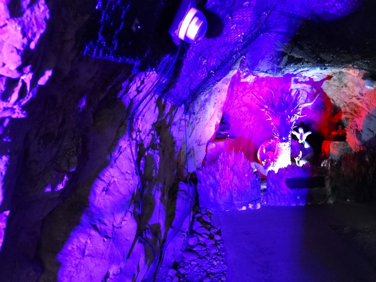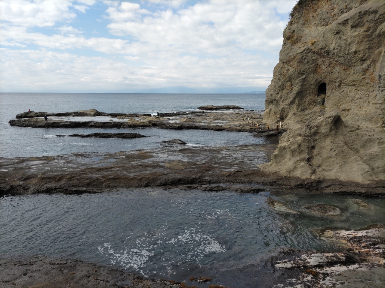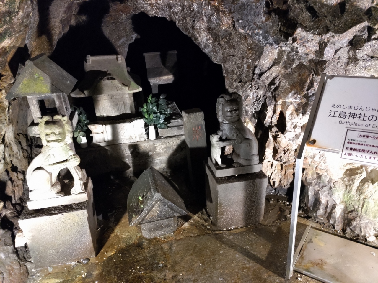 波の浸食によってできた海蝕洞窟である。江の島信仰発祥・龍神伝説の地である。2つの洞窟があり、最初の洞窟に入ると、両壁に江の島の歴史や文化、自然を紹介したパネルが展示してある。洞窟の奥を左折すると、スタッフがロウソクの灯りを手渡してくれて、それをもって奥に入るといくつかの仏像が置かれており、神秘的である。第2洞窟はイルミネーションで綺麗だが‥‥‥。洞窟の狭い部分の天上はクッションが貼り付けられているが、背の高い人はぶつからないよう注意が必要だ。入場料500円である。