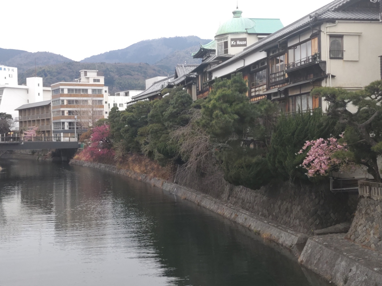 伊東園ホテル本館の前の道路、県道12号を100mほど南に下った道路の西側に伊東園ホテル松川館ある。本館で「湯めぐりパス」を借りて(無料)、3分ほど歩いて松川館にやってきた。フロントの奥のエレベータで地階に降りると、浴場へ通路が続いている。露天風呂に入ったが、泉質は良いが少し狭い気がした。入浴後1階ロビーで休憩をした。庭園の河津桜が満開で、池とのコントラストも良くて素晴らしい。